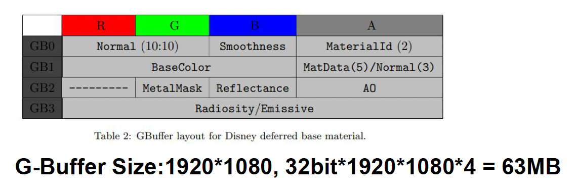 在延迟渲染中,像深度、法线等信息都存储在一个巨大 G 缓冲区中。而最近新发展出来的一个技术是可见性缓冲区(visibility buffer),它存储的东西就没有那么多了,仅包括:
