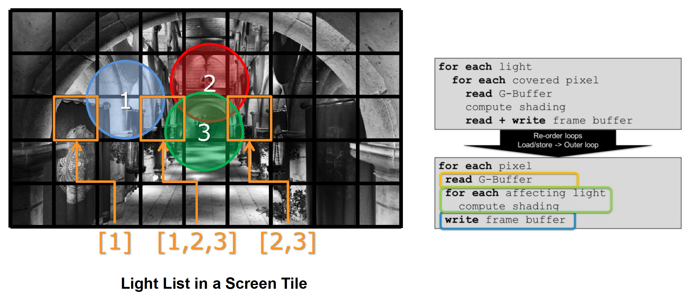 该算法带来的额外好处是同时将光进行切割,将其划分到一个个块中,这样方便区分某个块中存在哪些光照(被记录在光照列表(light list) 中