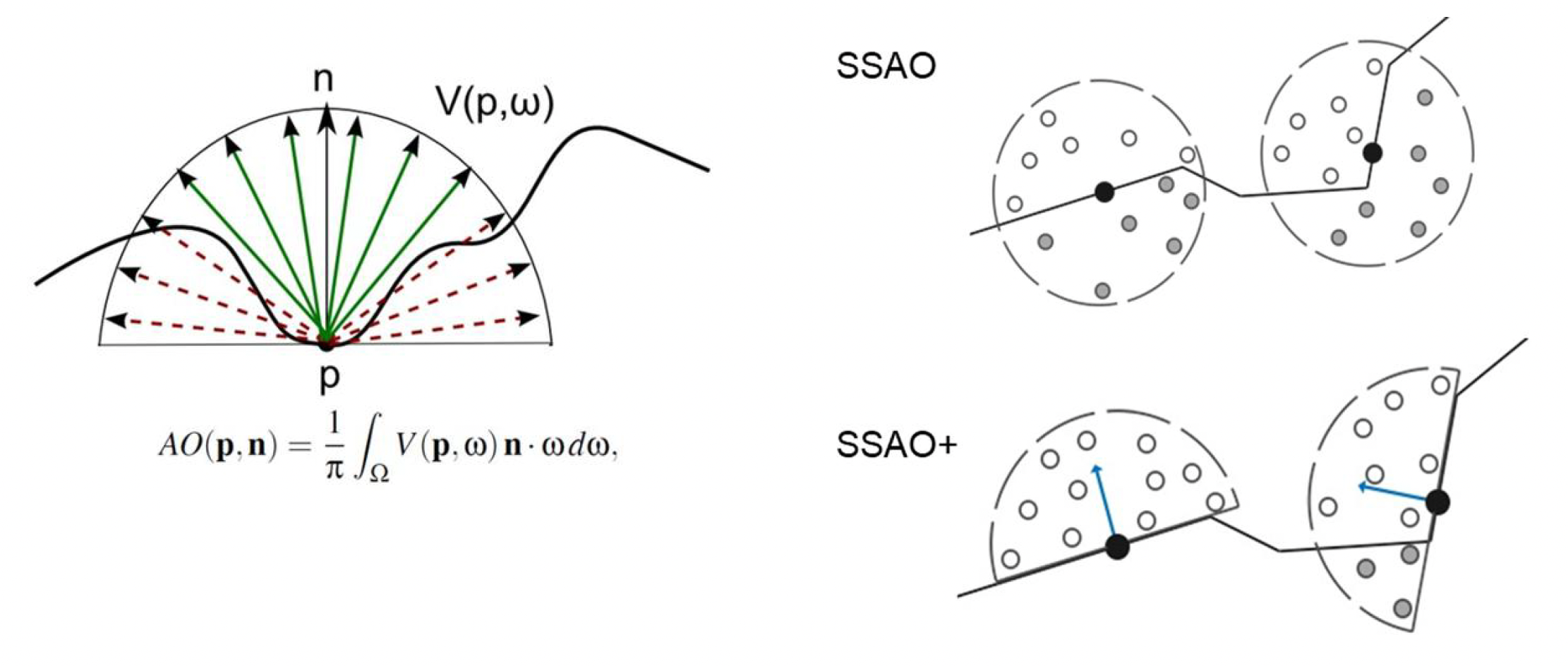 SSAO+ 是基于 SSAO 的改进方法,它的思路是沿着法线方向对半球采样,而不是完整的球。
