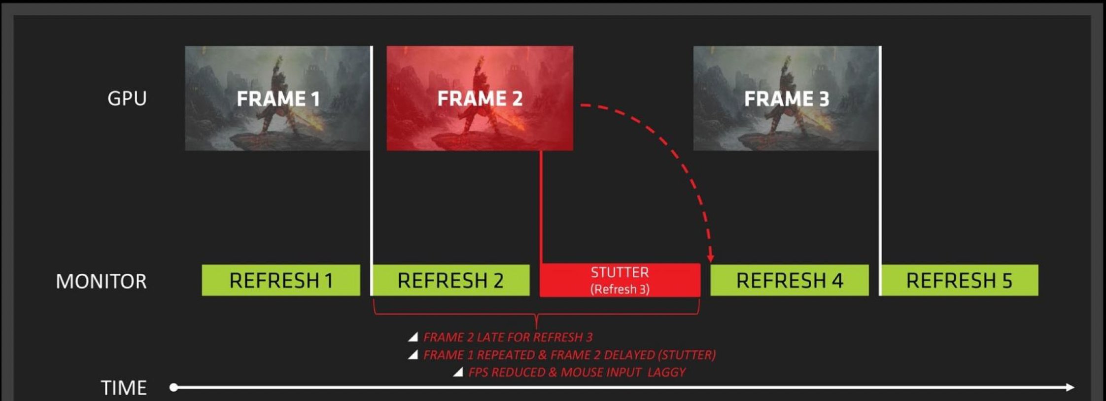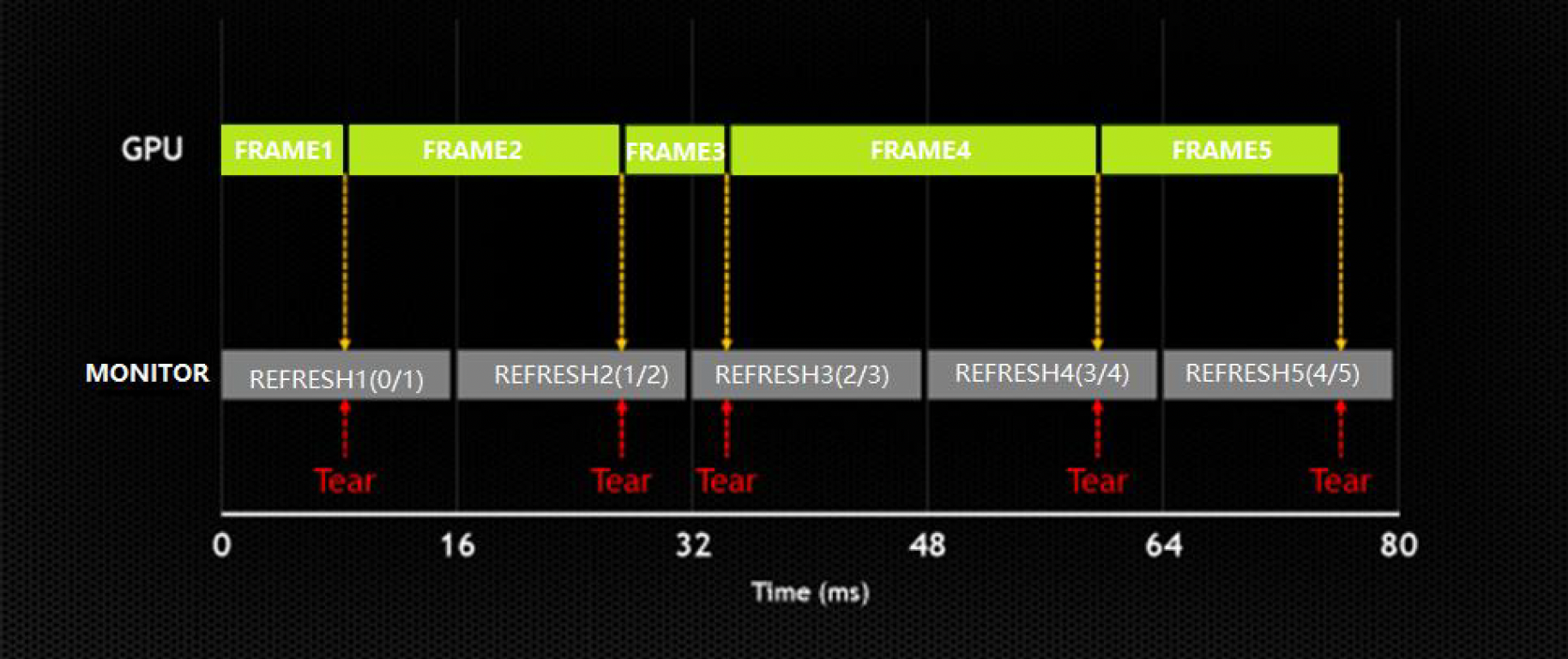 产生这一现象的原因是:在大多数游戏中,GPU 的帧率可能会不稳定。当新的 GPU 帧更新处于前一个屏幕帧的中间时,就会出现屏幕撕裂的现象。