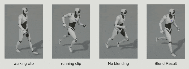 混合的数学基础也是 LERP。但不同于之前在单个片段中插值,动画混合需要在不同片段之间的姿态中获取中间帧,并通过游戏参数(比如角色的速度等)控制权重。