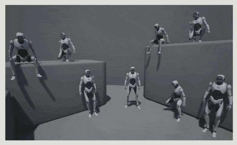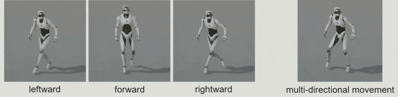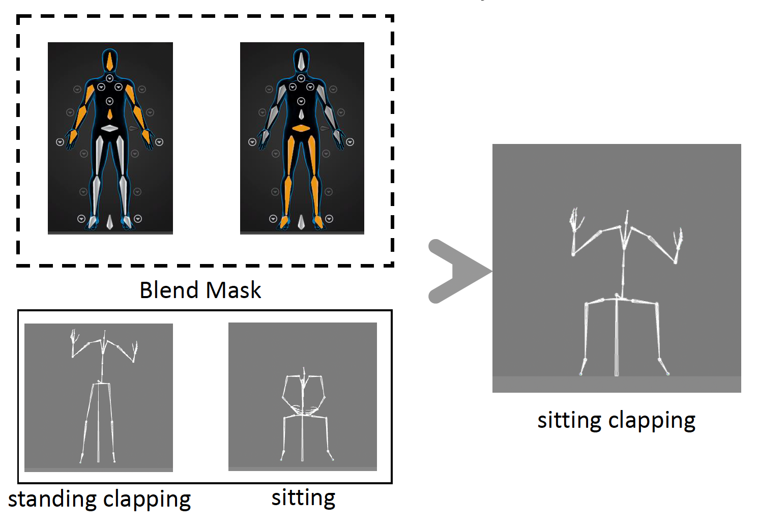 现在考虑另一种情况:如下图所示,我们希望机器人不管位于何种姿态都能完成鼓掌的动画。实现这种效果的一种技术为骨架遮罩混合(masked blending),比如把某个动画仅用于骨架的上半身,而另一个动画仅用于骨架的下半身,这样能够减少计算量。