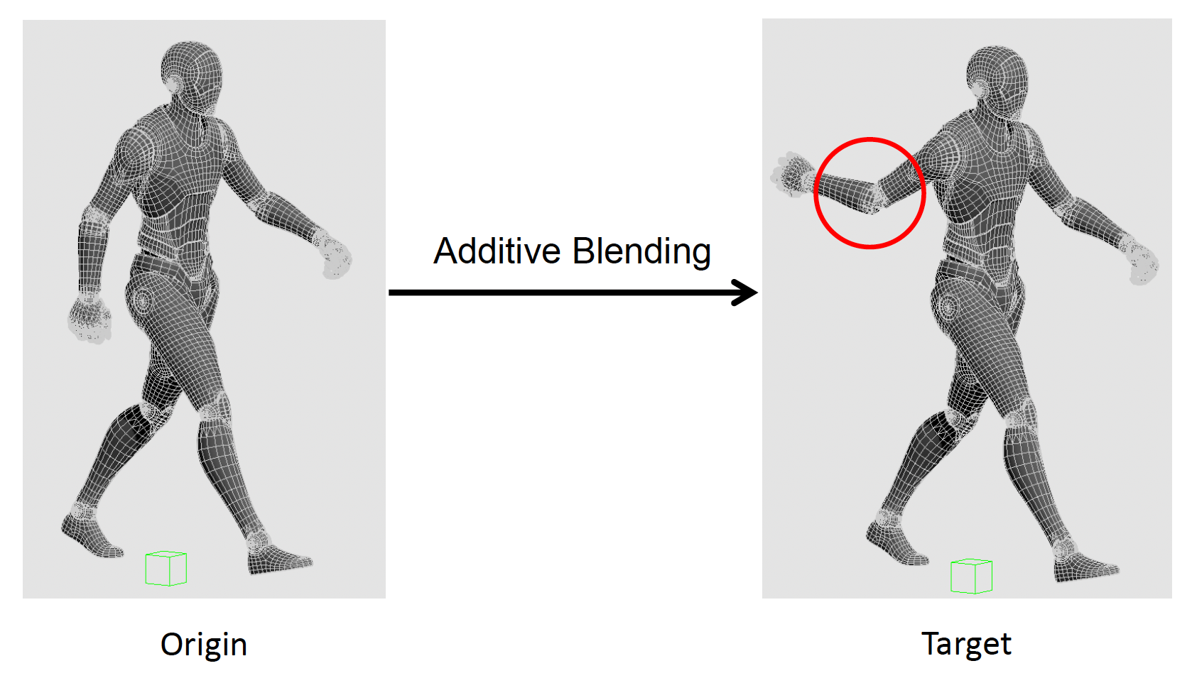 另外一种混合技术叫做加法混合(additive blending),即通过向常规片段添加一个差值片段来生成一个新的片段。所谓的差值片段(difference clip) 是指两个常规片段之间的差值。使用这种技术的目的是产生角色姿势和动作上的有趣变化。