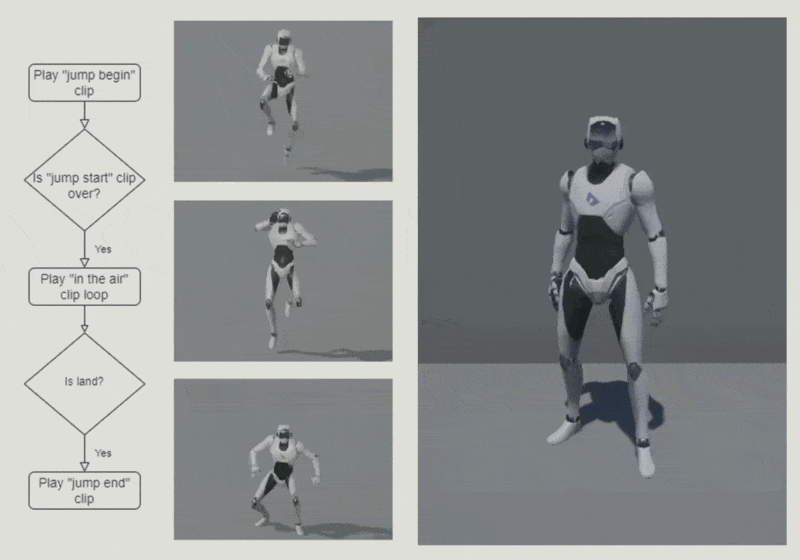 第二个要介绍的高级动画技术是动画状态机(animation state machine, ASM)。之所以需要这项技术,是因为在动画系统中很多时候会有多种状态在切换。以“跳跃 (jump)”这一动画为例,这一动画不能定死,因为跳跃的场景可能是不同的。一般来说,跳跃分为起跳、在空中和落地这三个阶段,这三个阶段有各自独立的动画片段。这些片段不能用到前面的混合技术,因为这是一个依赖状态切换的问题,需要用状态机来建模。