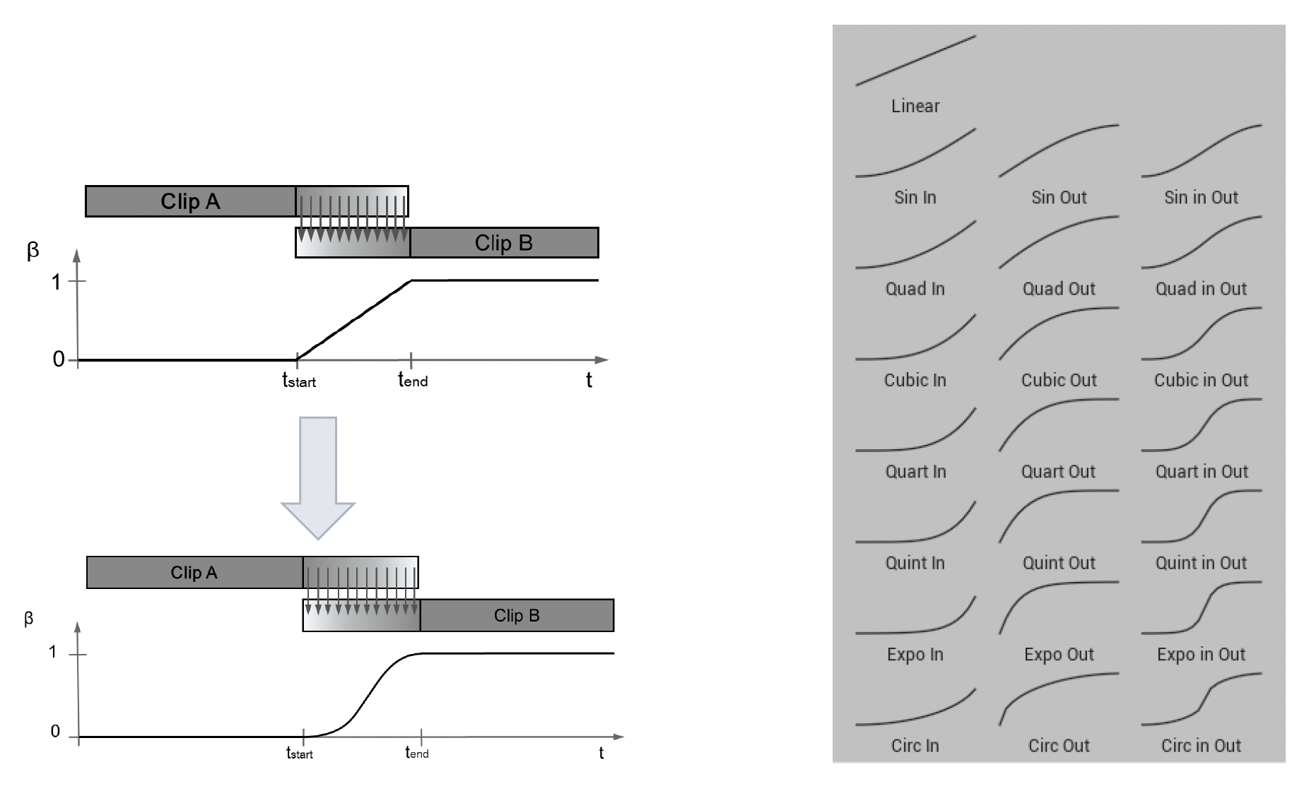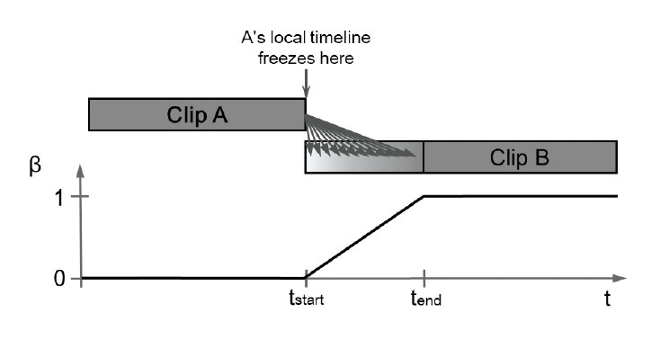 - 假如有两个动画片段 1 和 2,随着时间推移,1 的贡献量越来越少,2 的贡献量越来越大