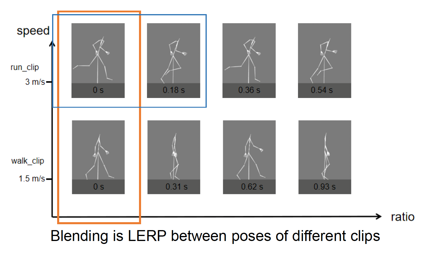 下面以从走(假设 1.5 m/s)到跑(假设 3.0 m/s)的动画为例分析各种动画混合的技术。