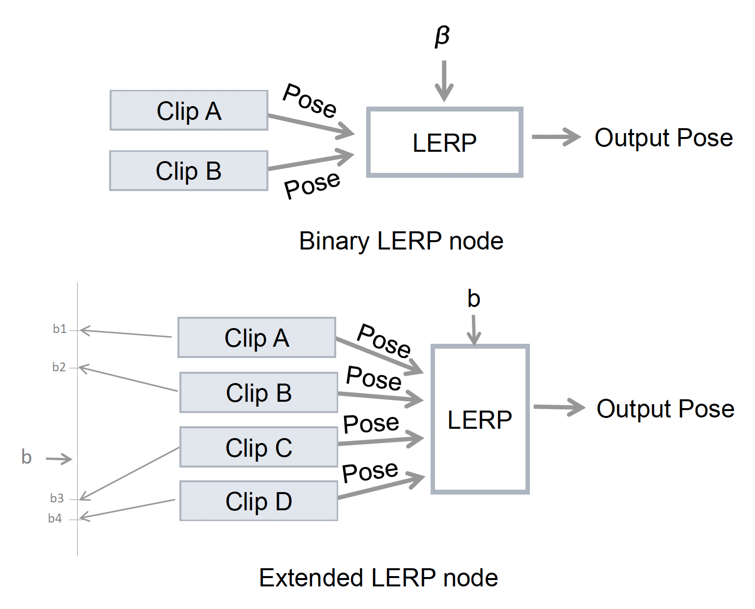 最简单且基础的节点是 LERP 混合节点,它以权重 \(\beta\) 对两个输入姿态进行线性插值,得到一个输出姿态。并且这种节点通常能扩展成多输入(三个或四个)的形式。