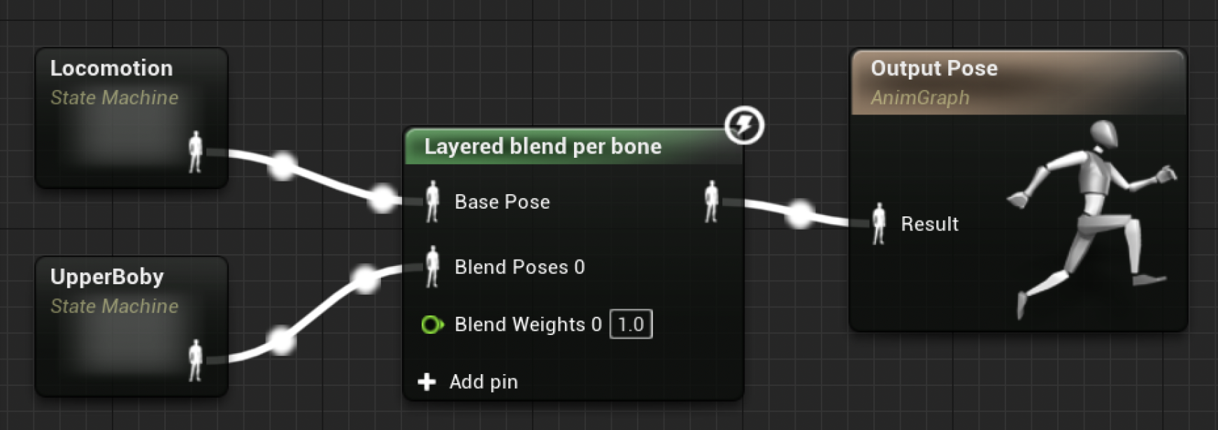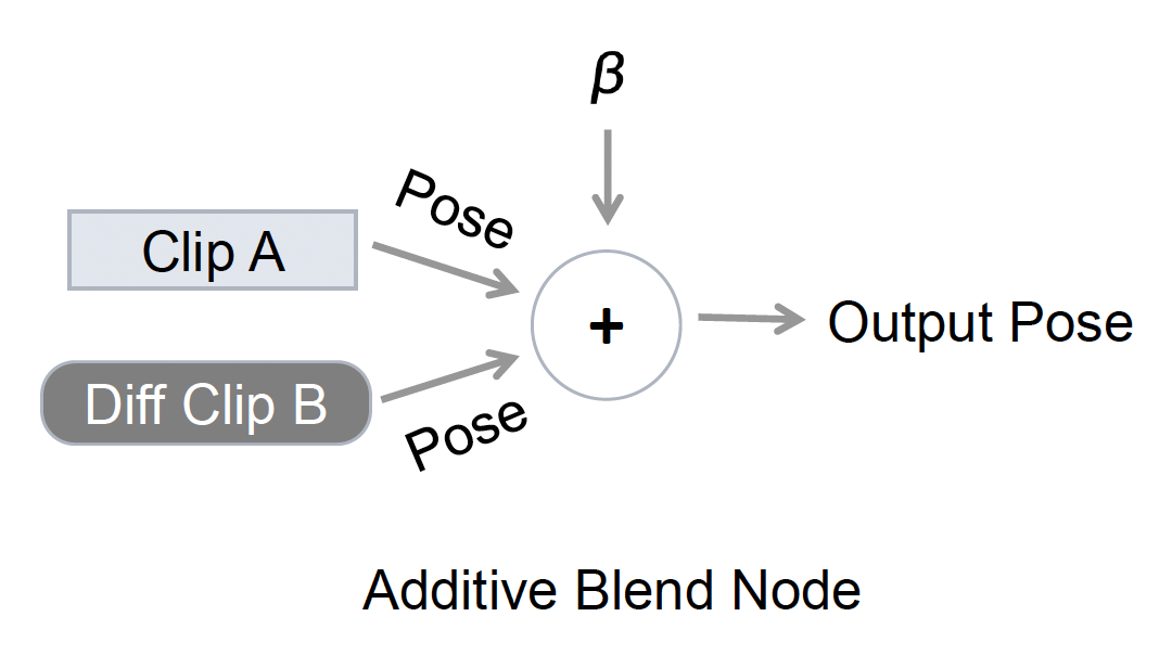 另一种基础非终结节点是加法混合节点(additive blend nodes),以权重 \(\beta\) 将第二个输入姿态(通常以一个差值的形式)添加到第一个姿态上,从而得到新的姿态。