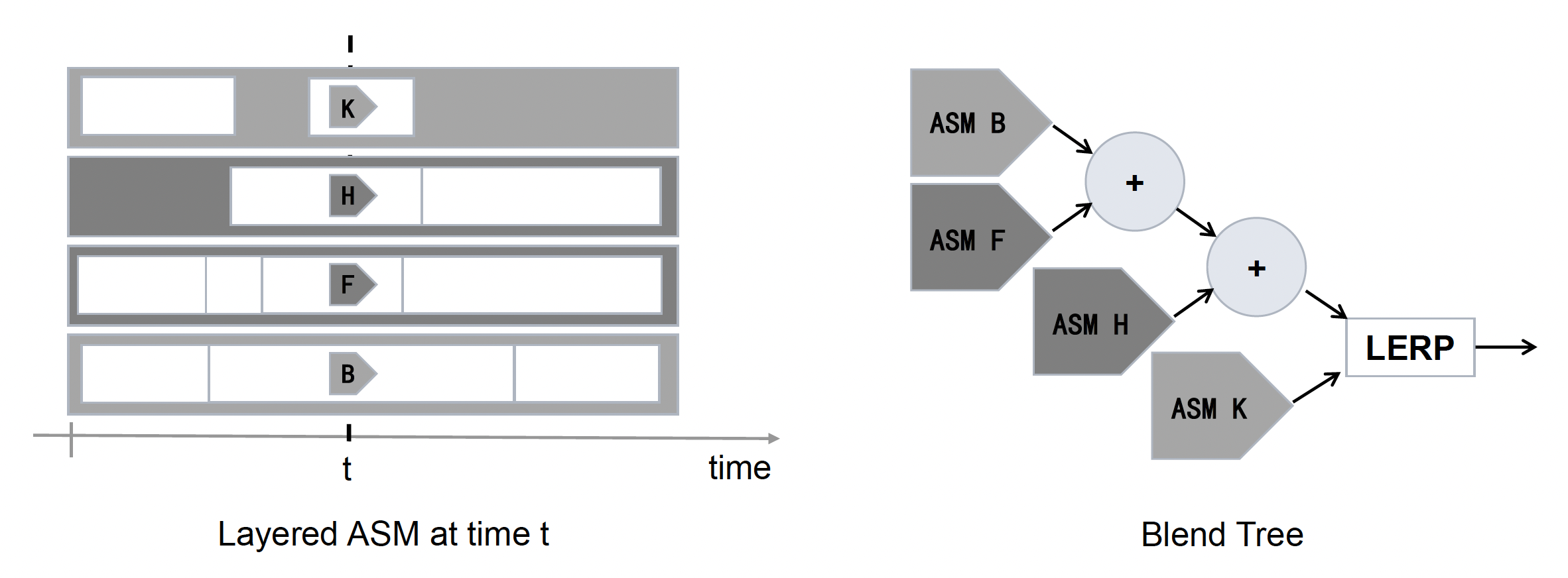 以前游戏中会用一种叫做分层(layered) ASM 的技术控制角色动画,使得一个角色的不同身体部位可以同时进行不同的、独立或半独立的动作。