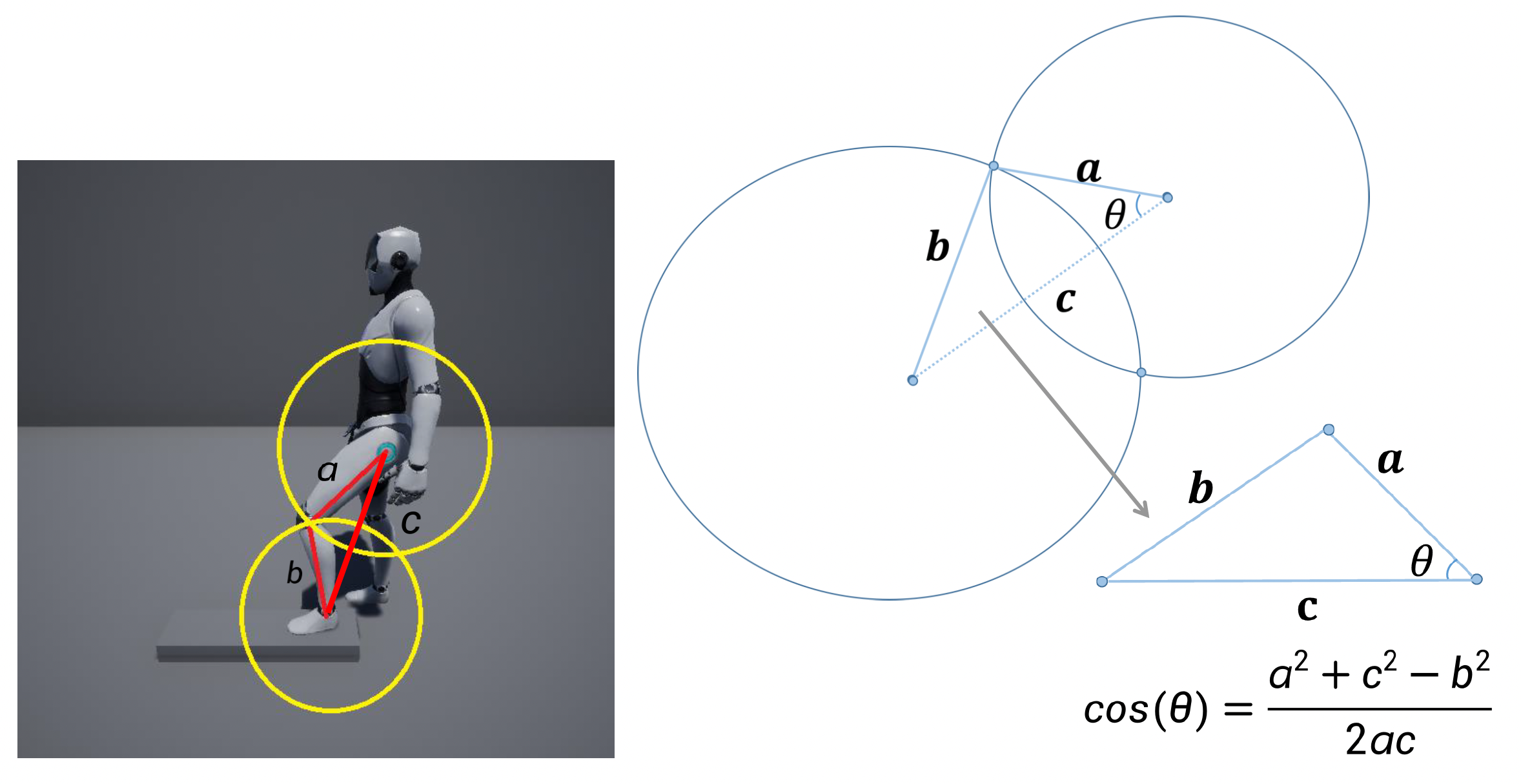 一个经典案例是角色在崎岖不平的地面或楼梯上行走,我们希望角色的脚总是能踩在地上而不是乱踩的、悬空的。最简单的方法是两根骨骼的 IK:假设大小腿各代表一个骨骼,两条边能确定第三条边,即大腿根部到目标点的距离。要计算大腿小腿各迈多少度,这就是一个简单的三角函数问题。