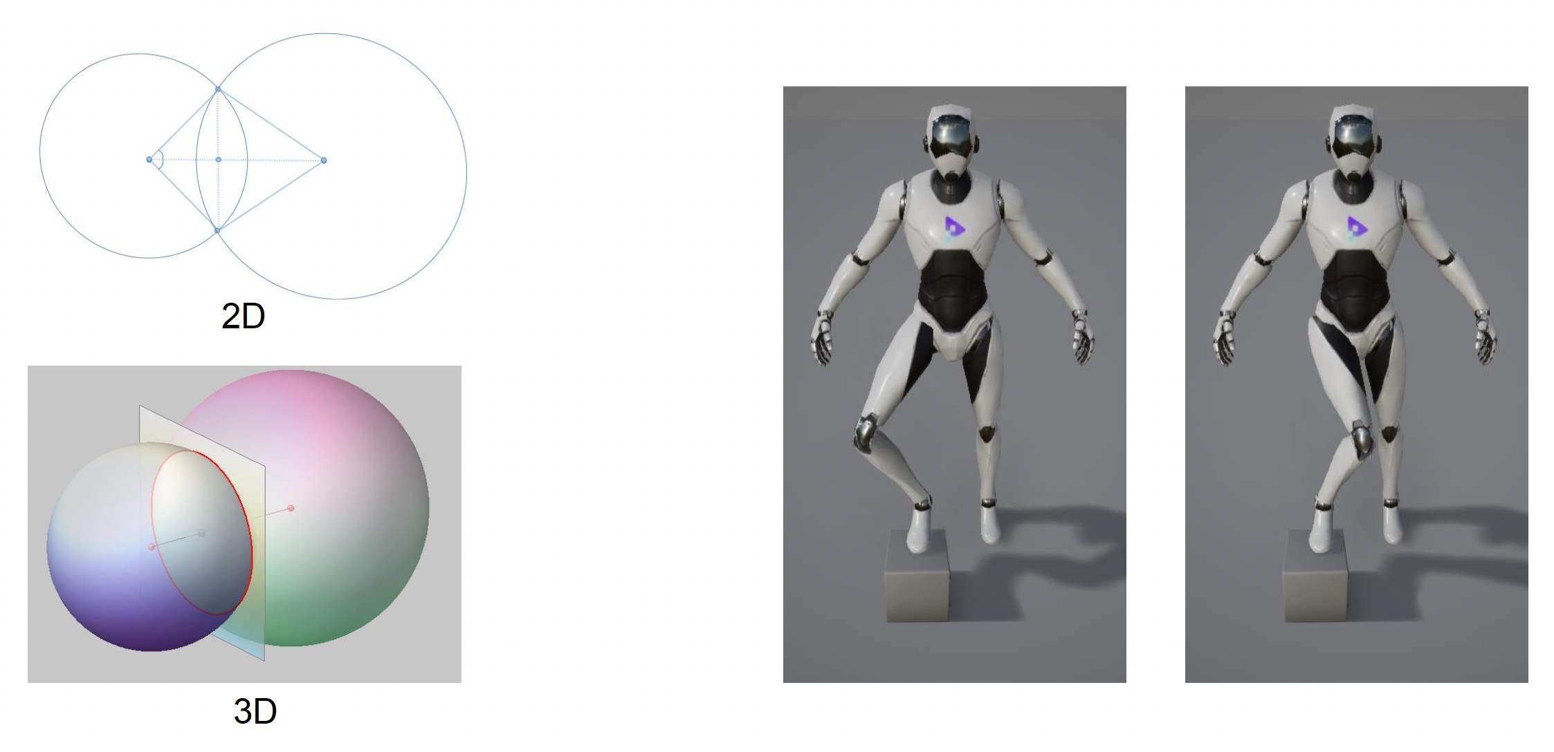 这个问题可以看作两个圆求交;而在三维空间中就是两个球求交,因此会出现多解问题,比如下面右图中角色无论是外八还是内八都可以到达目标点,艺术家肯定不会对此买账的。