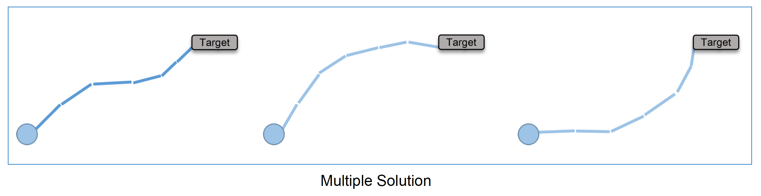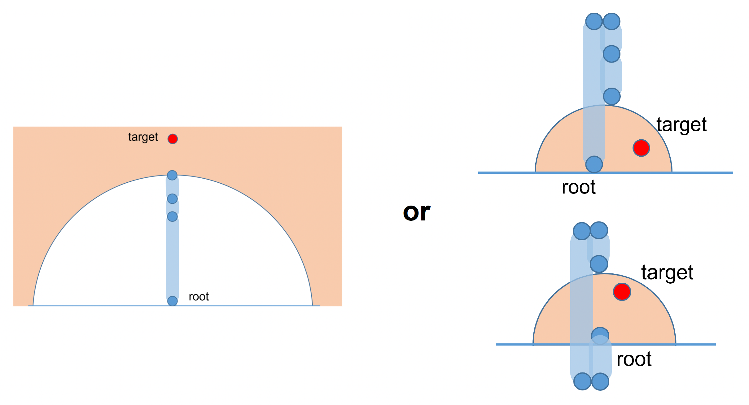 - 把所有骨骼拉直,看能否到达目标点;如果这样都够不到,那么无论怎么放置骨骼都不可能够得着(左图)