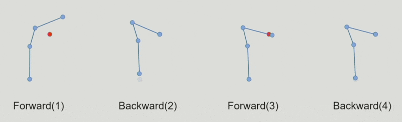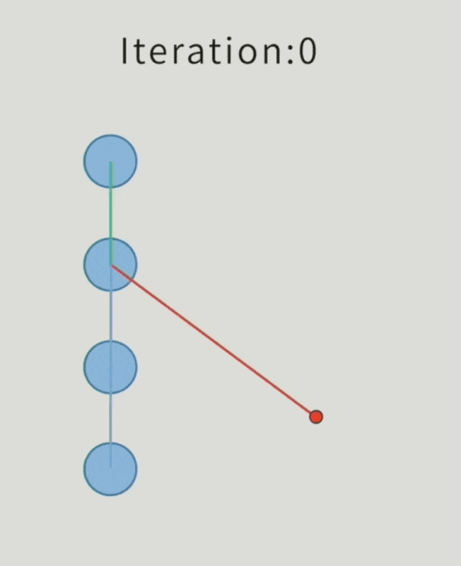 经过这么一趟迭代,根关节依然保持原位,而最末端关节会离目标点近很多;如果没有达到目标,那就再来一次或多次的前向 / 后向迭代,直到足够接近为止