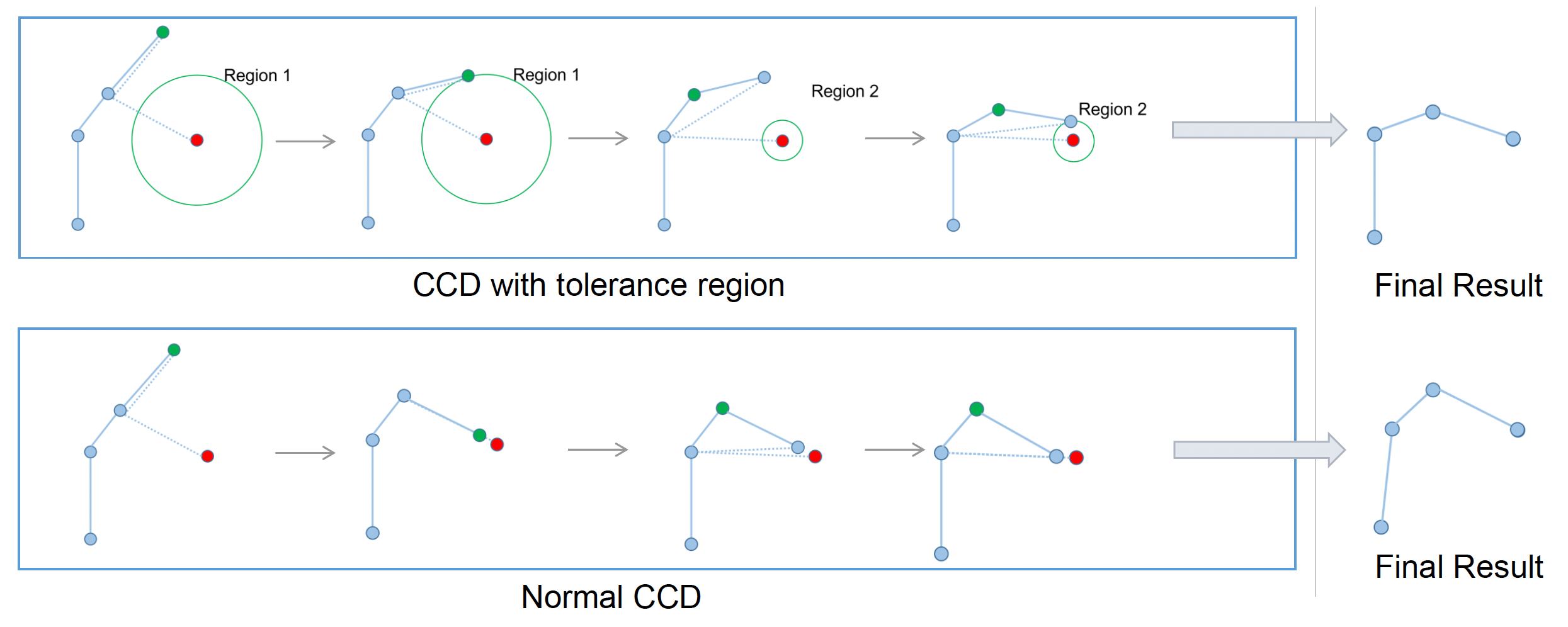 - 每个关节只向目标移动一小段距离,并将运动分布在多个骨骼上