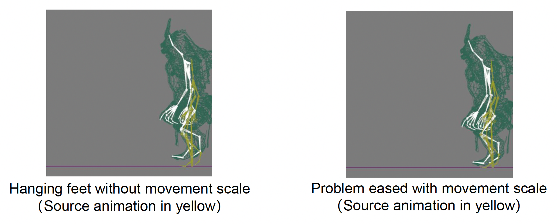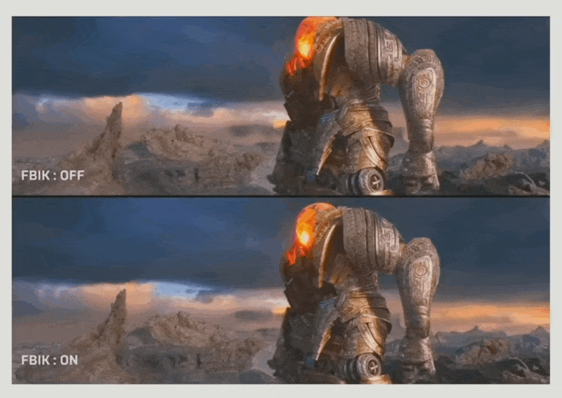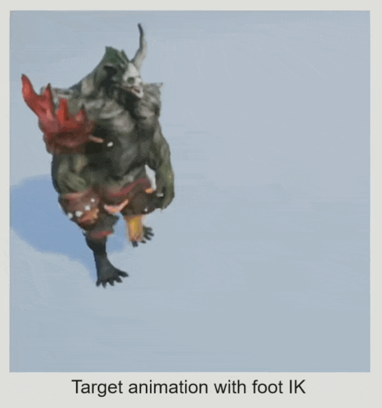 有时因角色之间体型相差太大,即便缩放后脚也没有正常着地,因此在重定向后还需利用 IK 将脚「锁」在地上。
