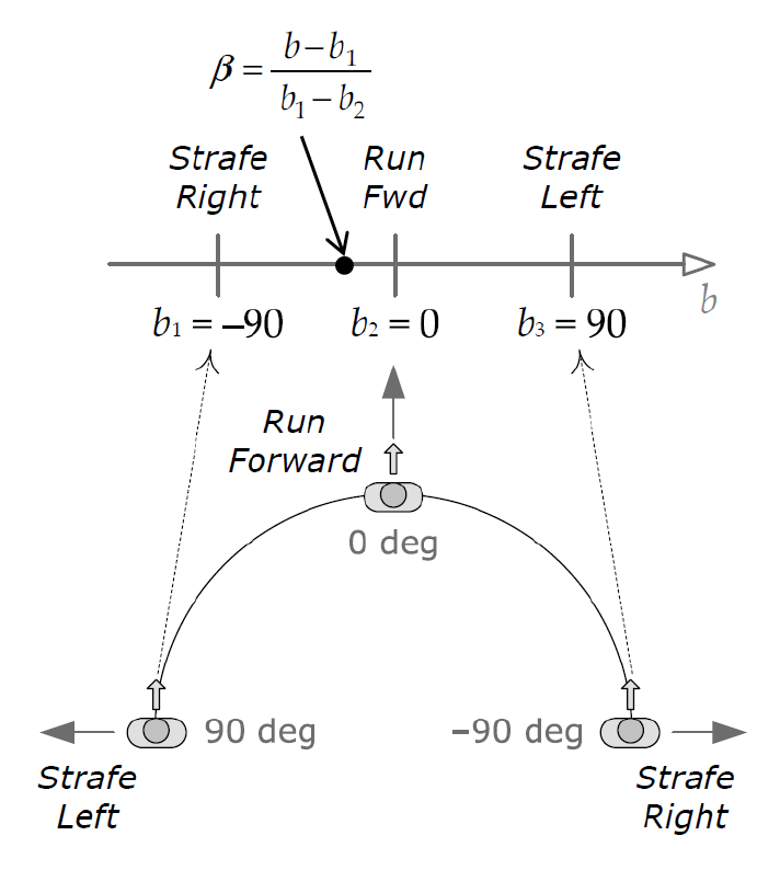 先来看一维的混合空间,此时只考虑方向的移动。我们可以只通过左移、前跑和右移这三个片段来混合得到任意角度的移动动画。