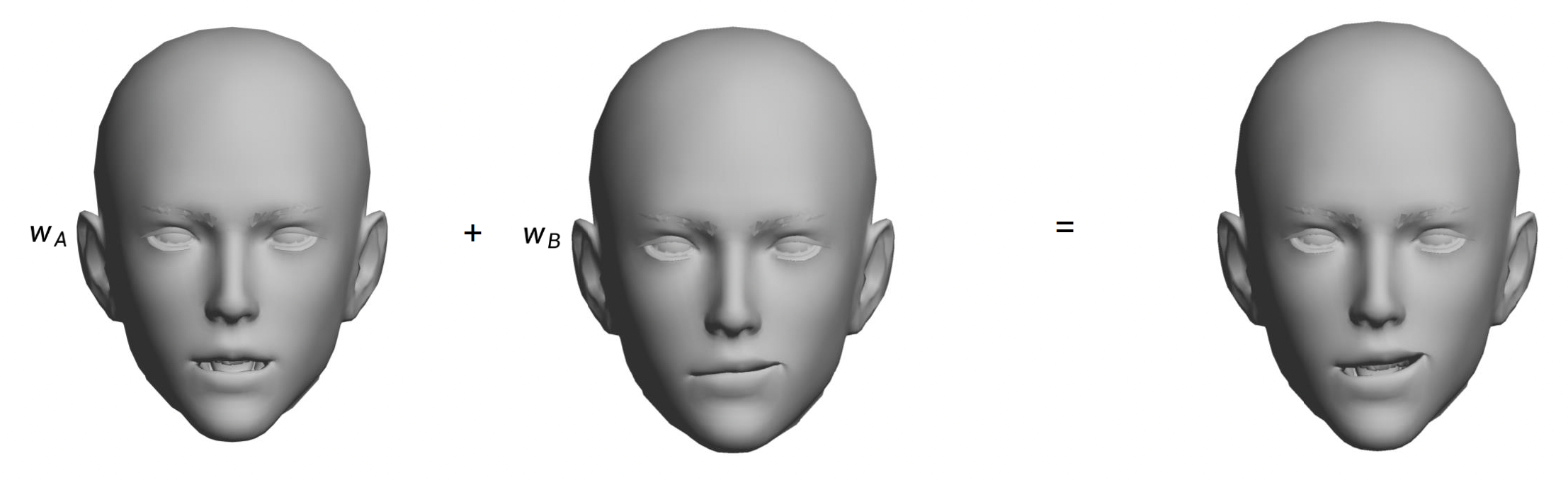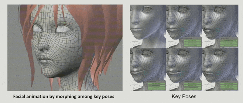 将 AU 组合的思路用到动画中,就是一种称为关键姿态混合 (key pose blending) 的技术。这些关键姿态是逐顶点动画的变体。