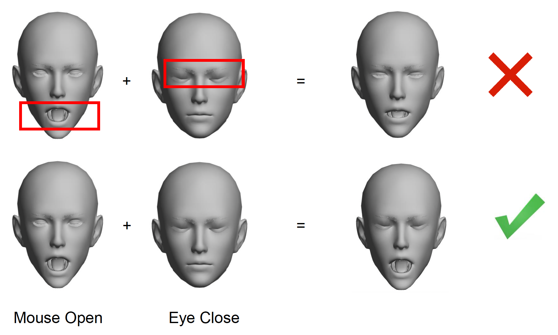 这种简单混合技术的问题是:有时我们不希望在混合时用到两张人脸的所有部分,比如只想用到第一个表情的嘴巴部分和第二个表情的眼睛部分。