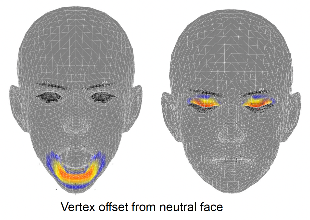 所以在形态目标动画中的做法是创建仅用于存储不同于中性姿态的顶点(偏移量)的 AU 关键帧(加法混合(additive blending)