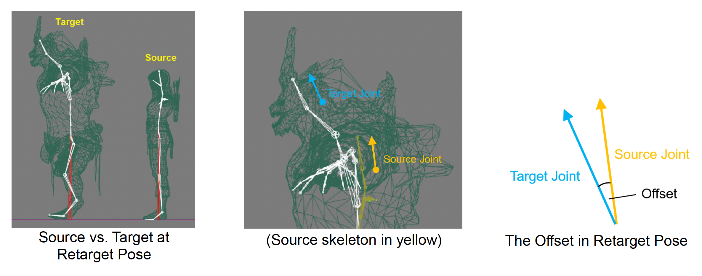 进行重定向时,我们可以忽略因角色体型不同等导致的源和目标的关节之间的偏移。
