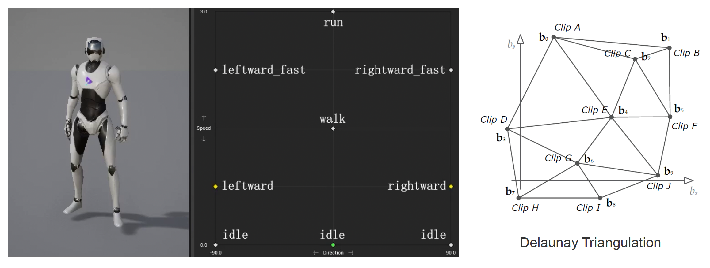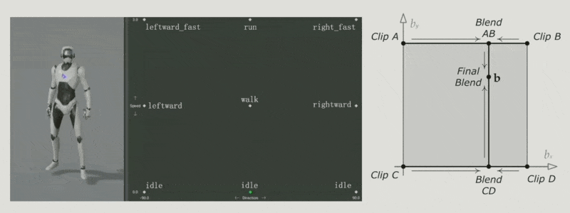 由于一个角色往往有多个动画片段,于是我们将上述方法泛化为一种叫做混合空间(blend space) 的方法。
