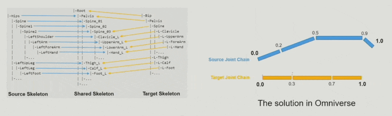 - 而 NVIDIA 的 Omniverse 给出的解决方案是将名称相同的所有骨骼看作一个映射,范围均为 [0, 1](右图)