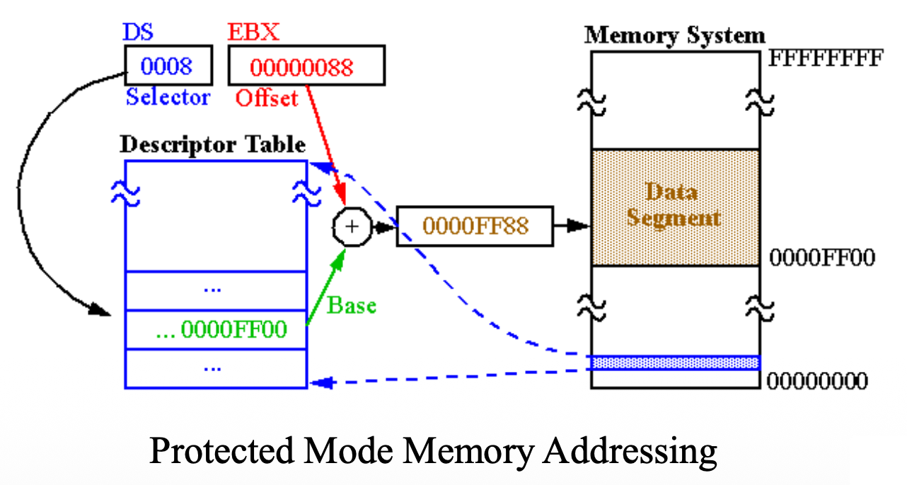 引入保护模式(protection mode),使用段寄存器的内容作为选择符 (selector) 或指针进入描述符表(descriptor table)