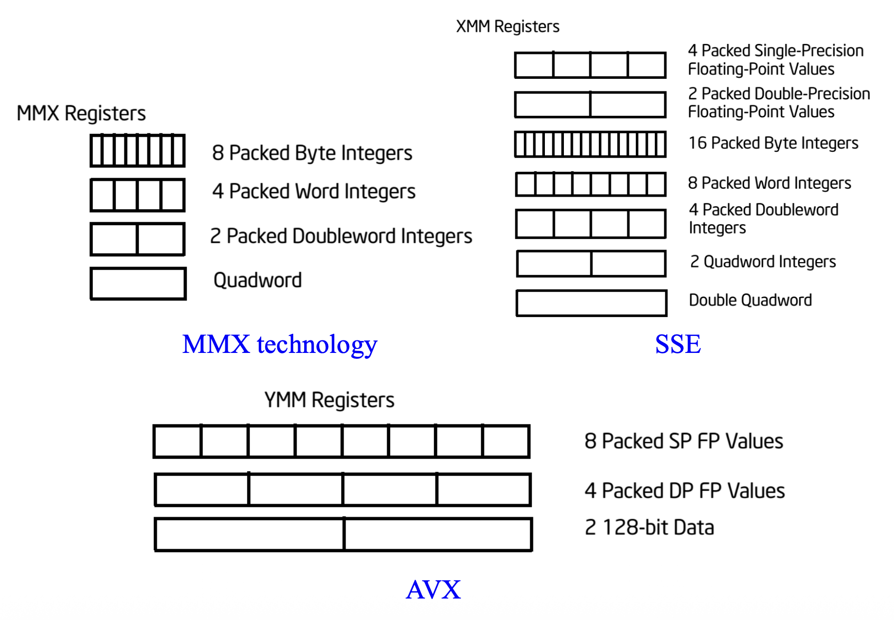自从 Pentium II 引入 MMX 技术以来,已引入了六个扩展(SSE、SSE2、SSE3、SSSE3、SSE4 和 AVX