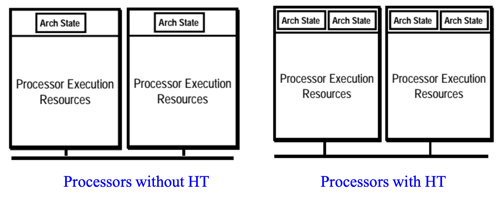 - 支持超线程技术的 IA-32 处理器包含两个或更多逻辑处理器,每个都有独立的 IA-32 架构状态