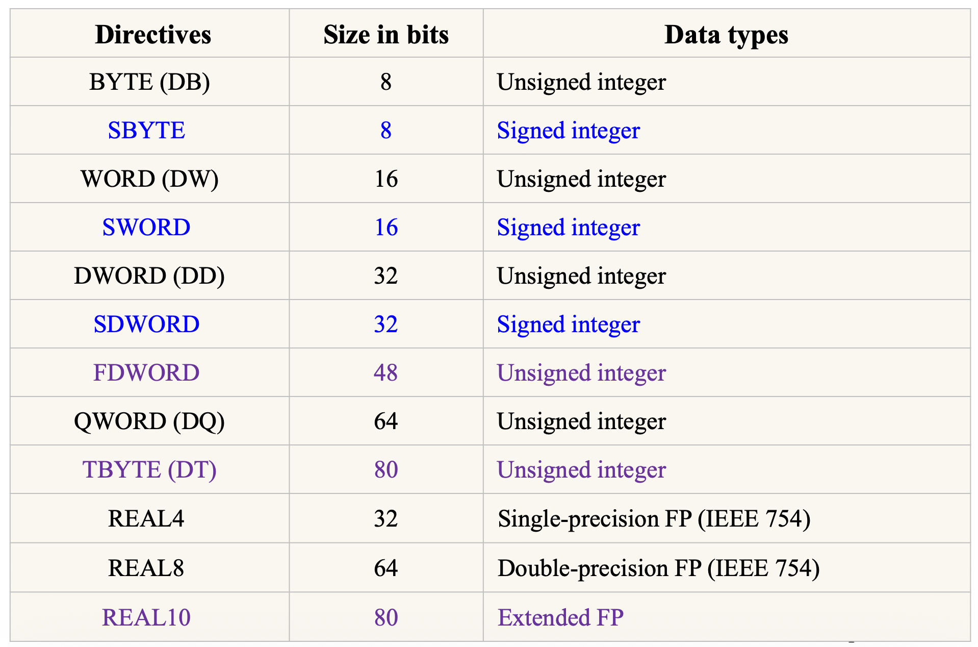 - 汇编器会用单精度或双精度浮点数来定义实数