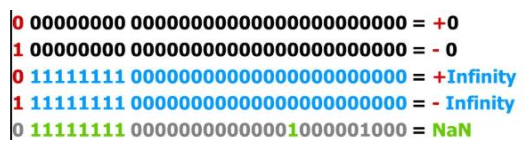 ) ,指数全为 1,尾数全为 0 - NaN(Not-a-Number):符号位随意,指数全为 1,尾数是除了全 0 外的任何情况
