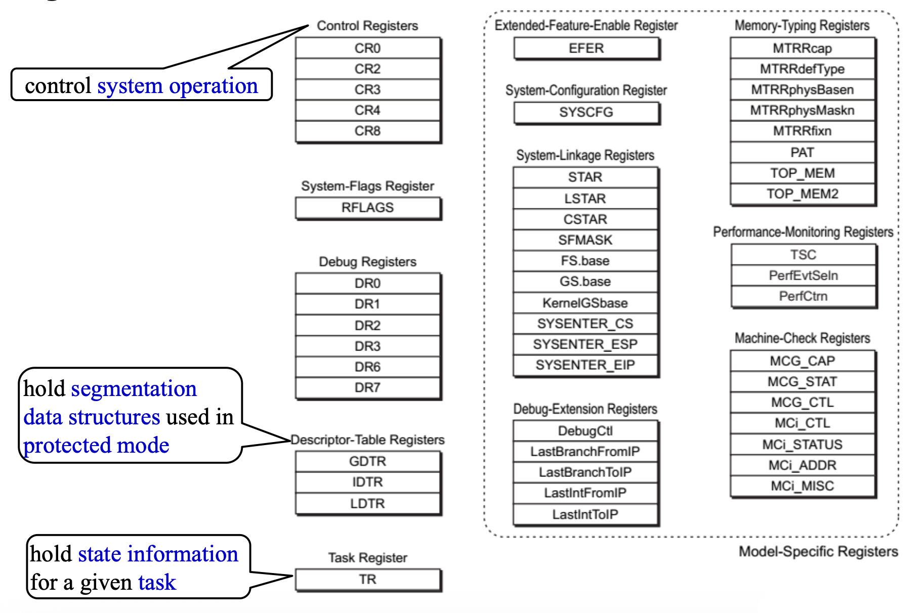 特殊目的寄存器(special-purpose registers) 包括:RIP, RSP, RFLAGS,以及段寄存器 CS, DS, ES, SS, FS 和 GS。