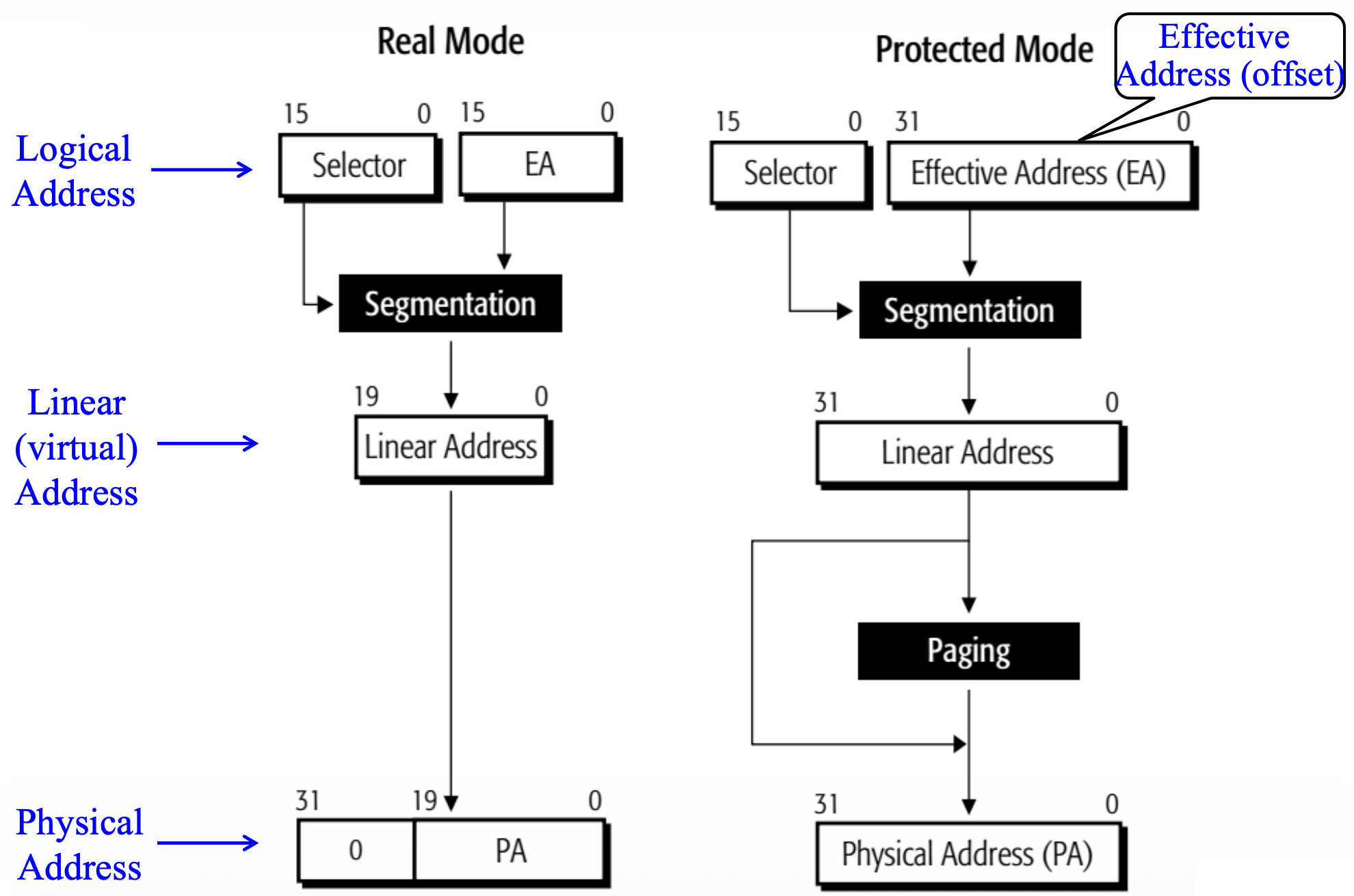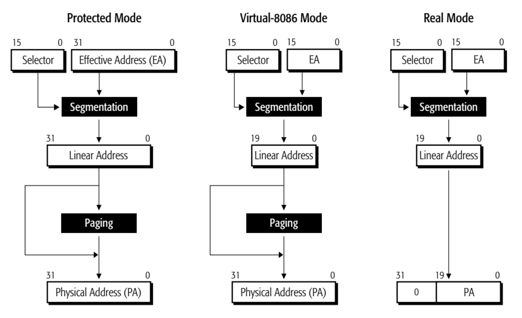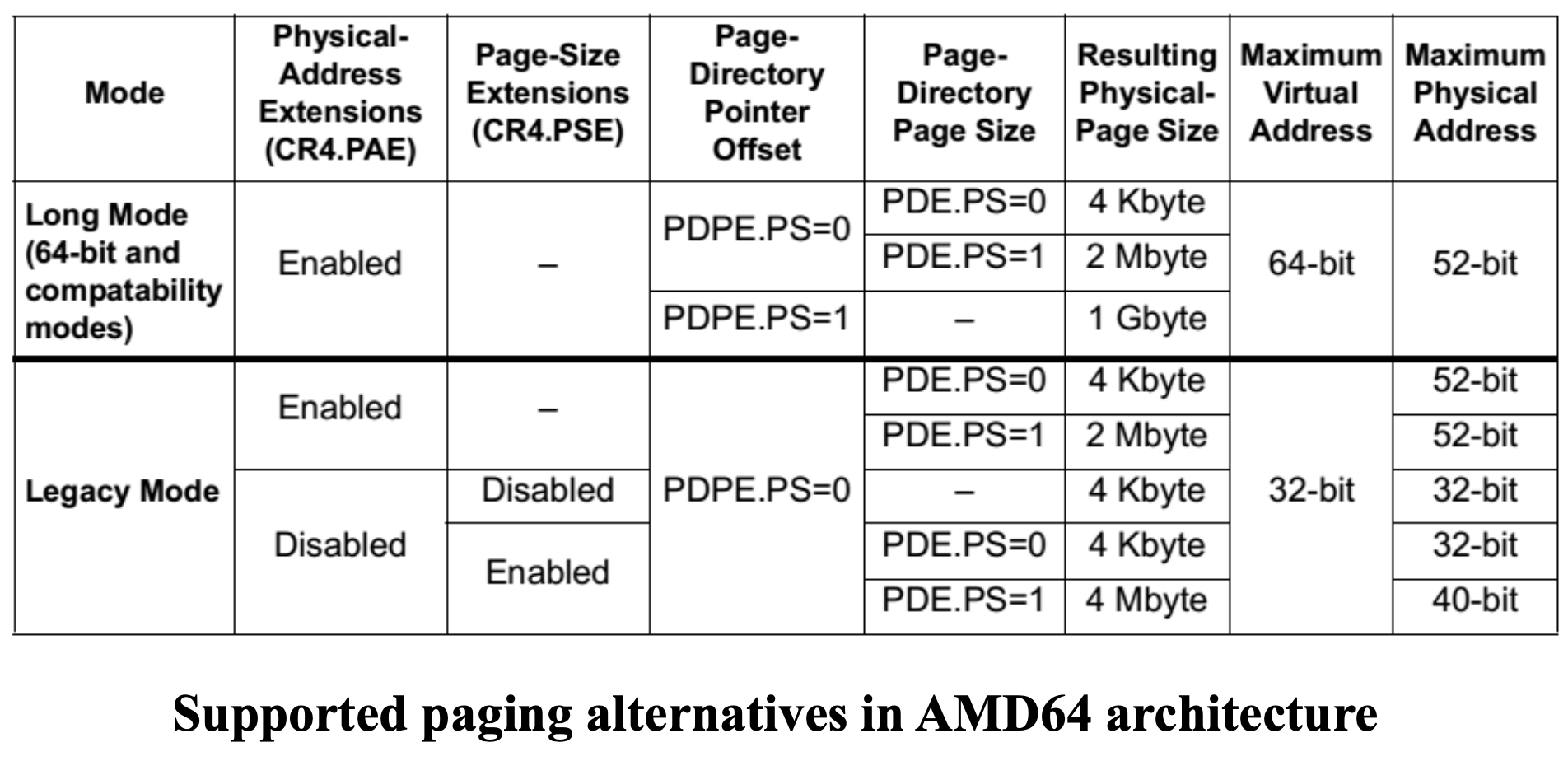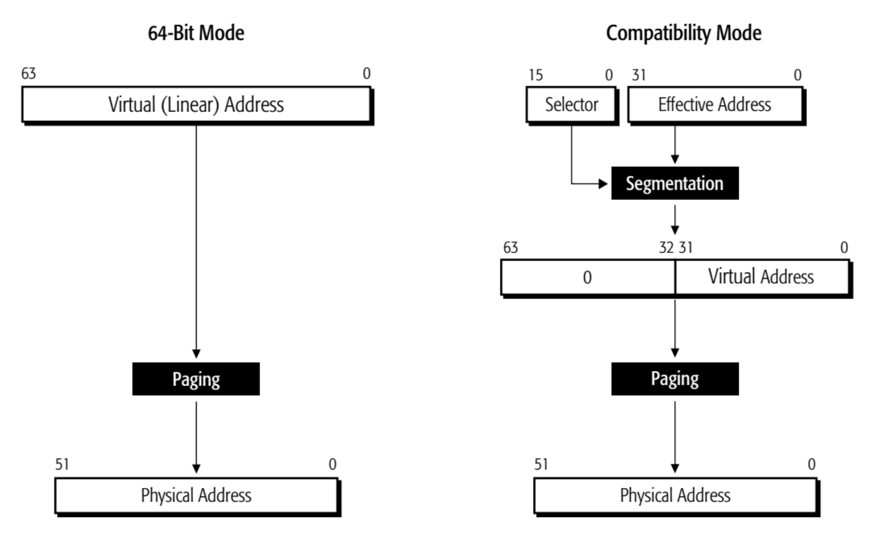 Intel-64 处理器支持四种不同的分页模式,其中两种用于传统模式,另外两种适用于 IA-32e。