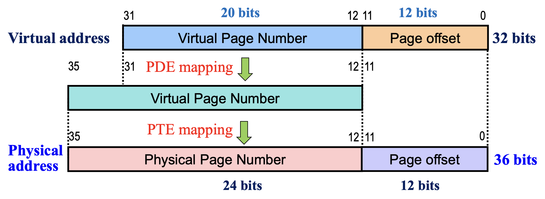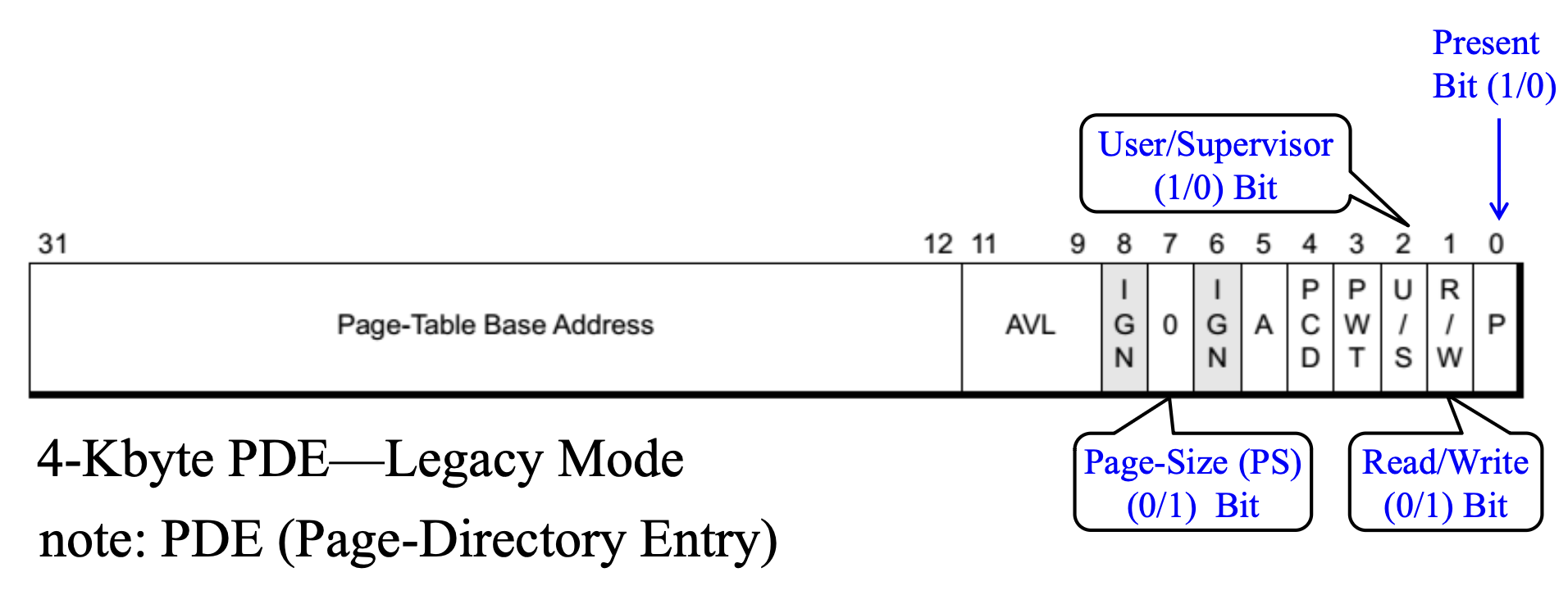- 当 CSR.PSE = 1 且 PDE.PS = 0 时,PDE 映射到一个 4KB 大小的页