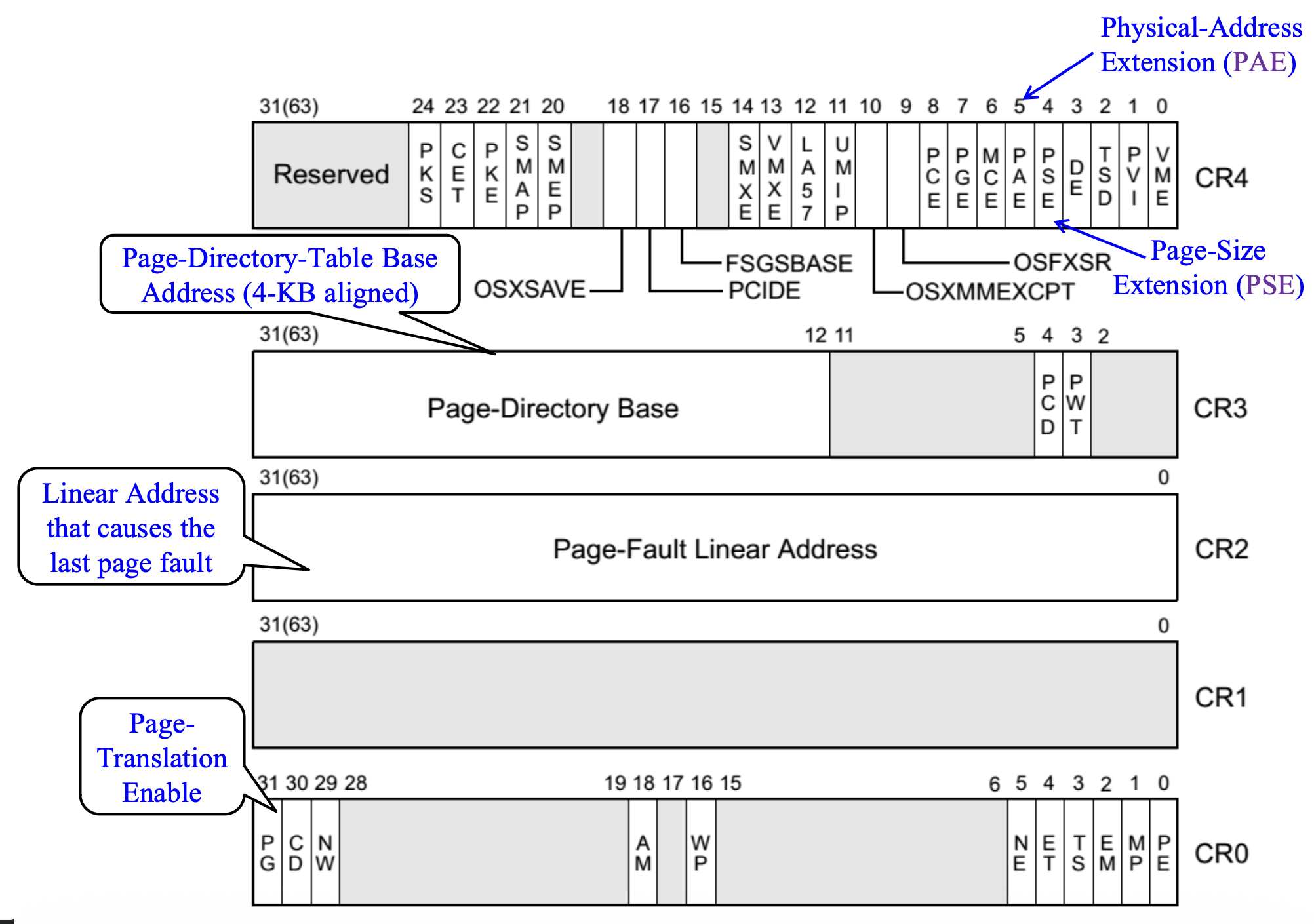- 页大小扩展(page size extension, PSE):用于在 4MB 页面中将线性地址映射到物理地址
