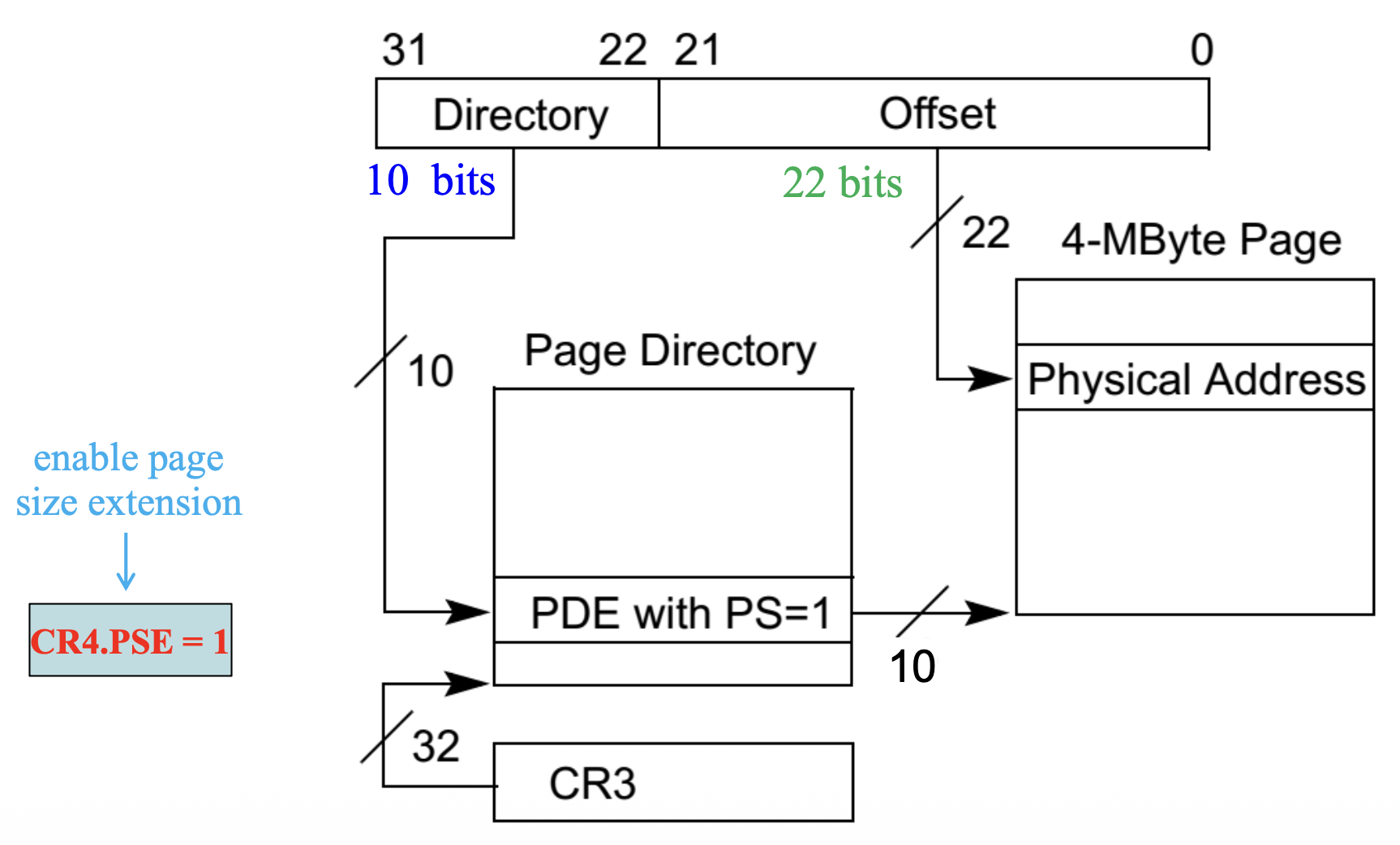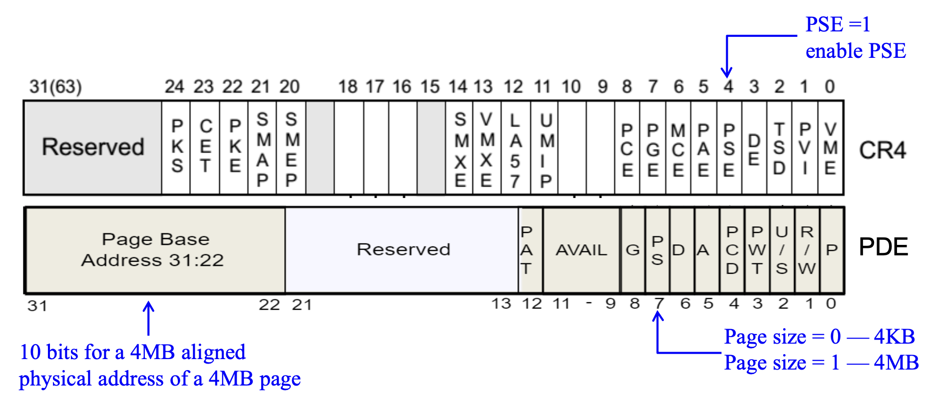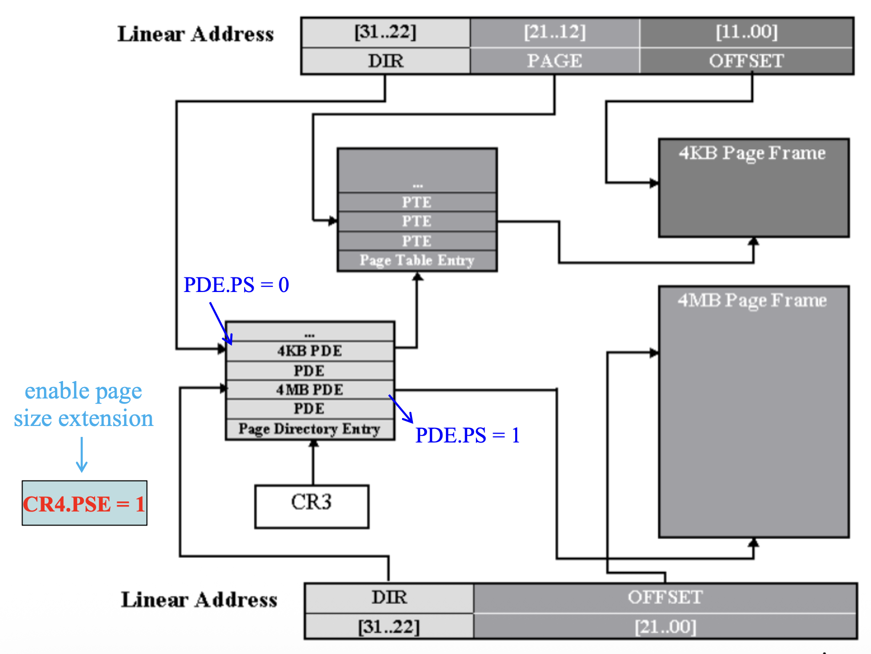 ) ,PAE 自动使用页大小位,因此忽略 CR4.PSE 的值,此时可用的大页大小为 2 MB - 如果物理地址扩展被禁用(CR4.PAE = 0)且 CR4.PSE = 1,则大物理页大小为 4 MB