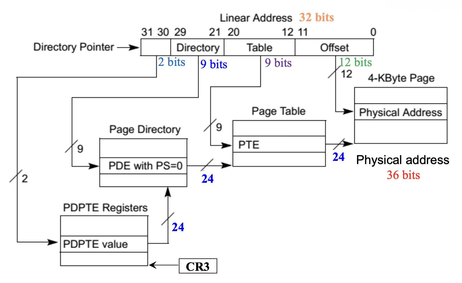 - 如果同时满足 CR4.PAE = 0 和 CR4.PSE = 0,唯一可用的页面大小是 4 KB