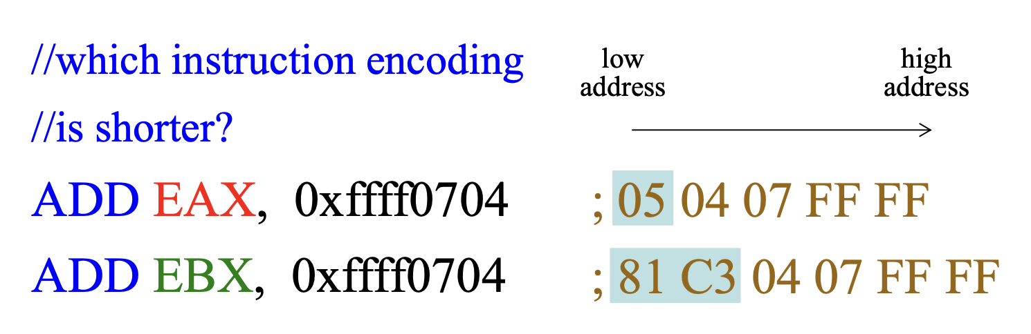 ADD指令中使用EAX相比使用其他寄存器少 1 字节,因此它具有更高的代码密度,并且更对高速缓存更友好 (cache-friendly)
