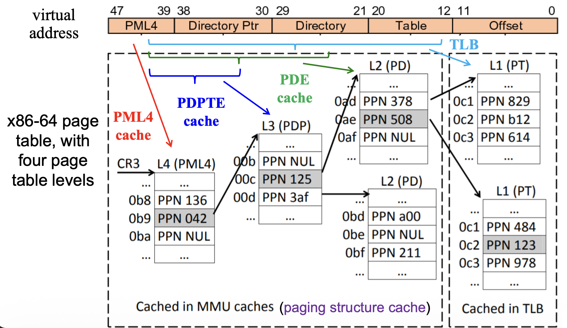 虽然页表的叶级被缓存在 TLB 中,但上级结构则缓存在 MMU 内,这些结构被称为分页结构缓存(paging structure cache)