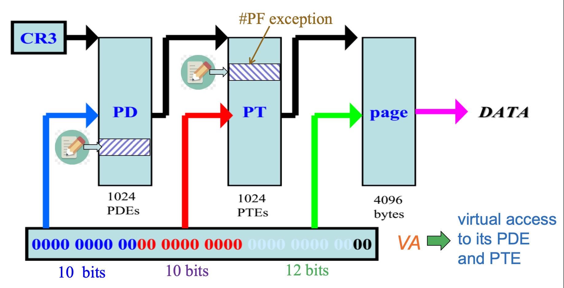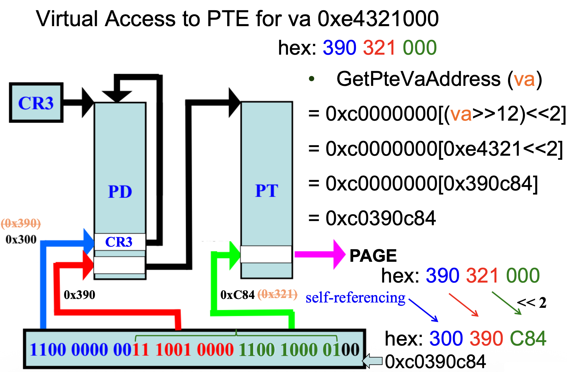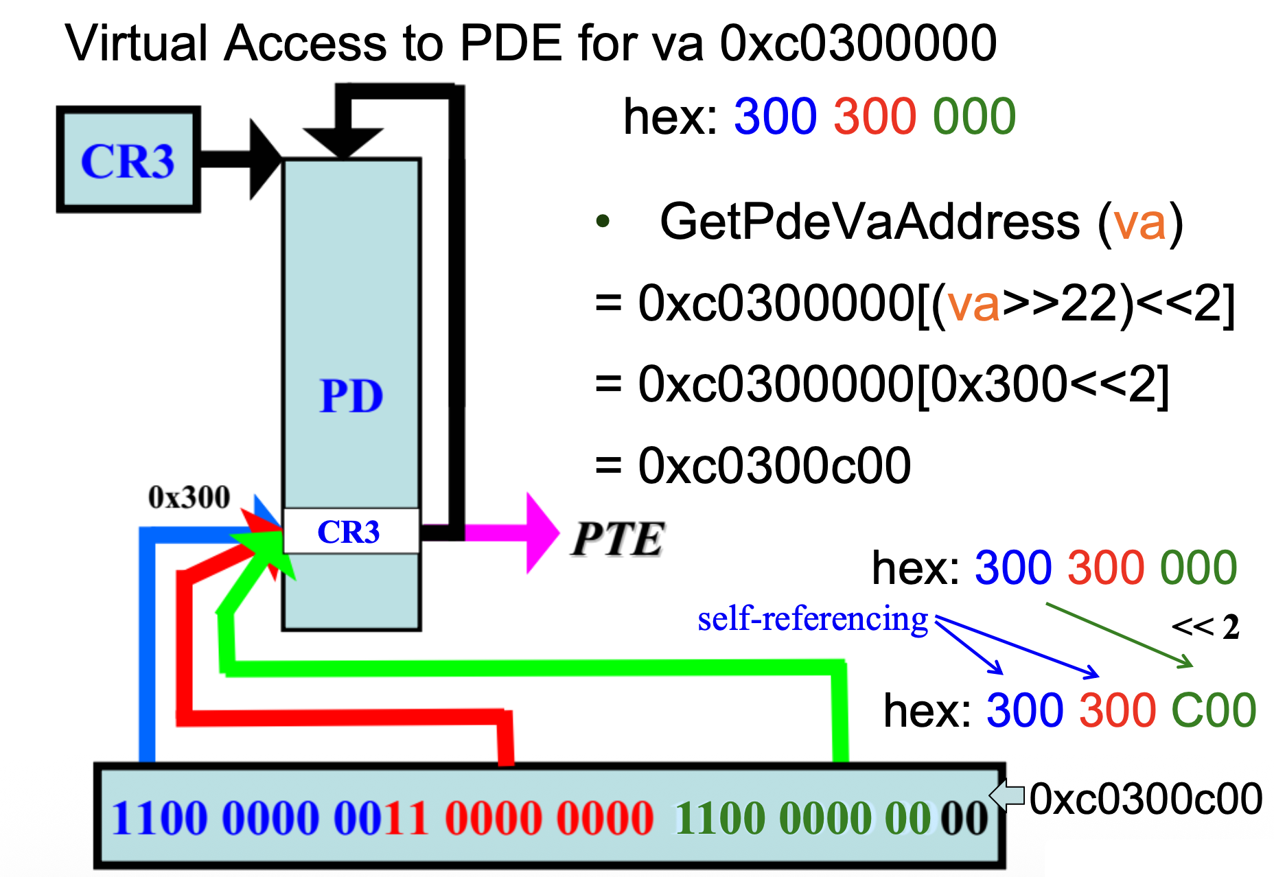 0x300项作为自引用条目,指向页目录本身 - 给定一个虚拟地址 VA,其 PDE 和 PTE 的虚拟地址可通过以下方式获得: