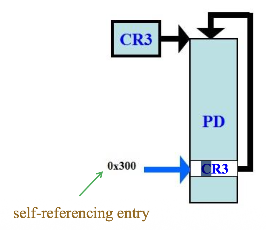 - 自引用项(self-referencing entry)(也称为身份映射 (identity mapping))为 OS 提供了一组虚拟地址,使得系统能够在虚拟地址空间中引用和修改任何页表
