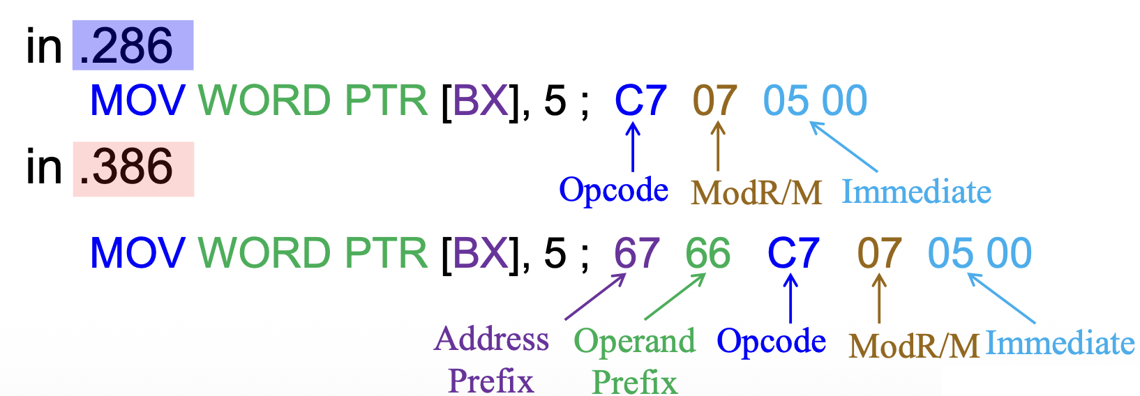 • 处理器指示符(例如,.286.386)隐式定义默认操作模式