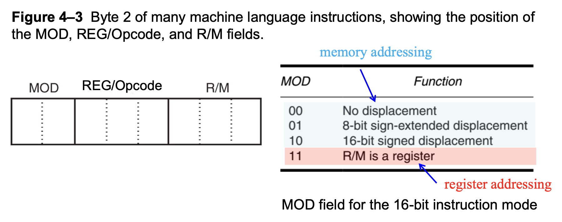 • 如果 MOD 字段包含 11,则选择的是寄存器寻址模式,此时会使用 R/M 字段来指定一个寄存器