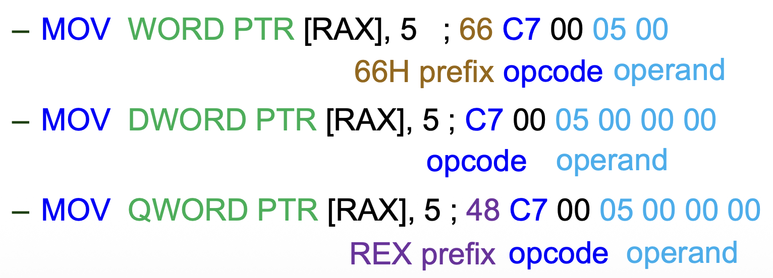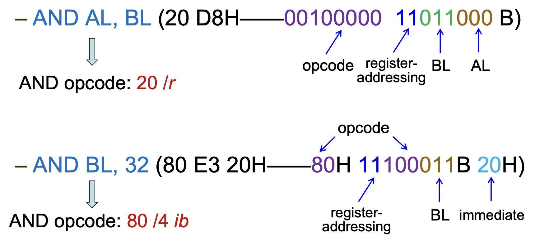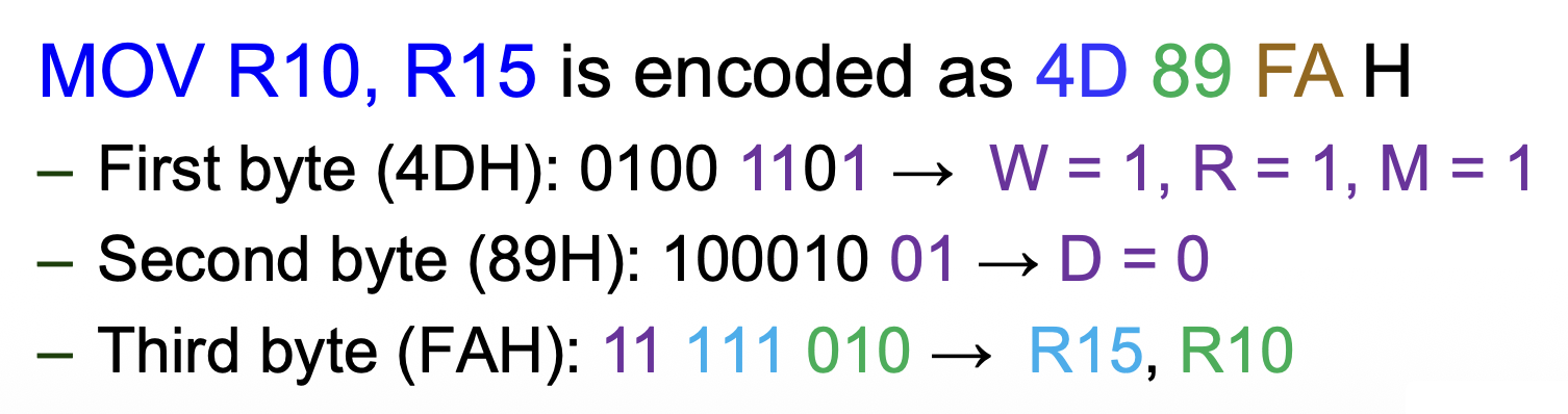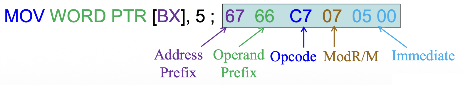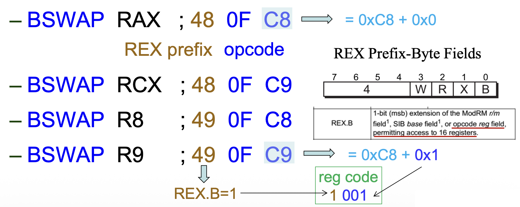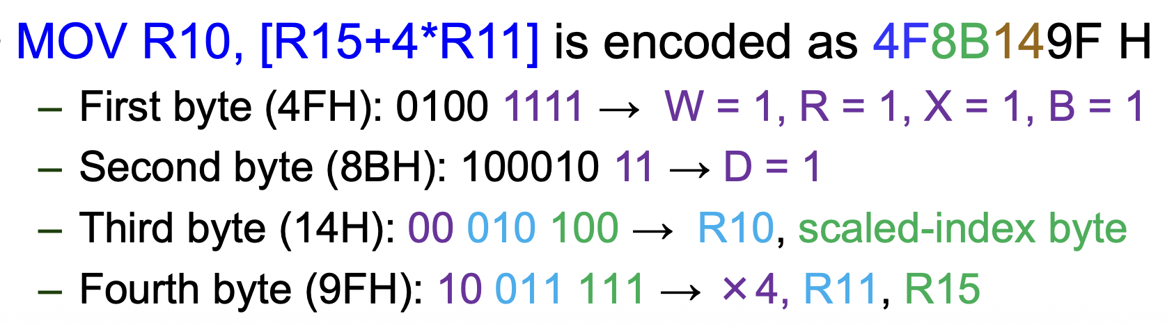 • 指令以小端序(little-endian) 存储在内存中,即指令的第一个字节存储在最低的内存地址上