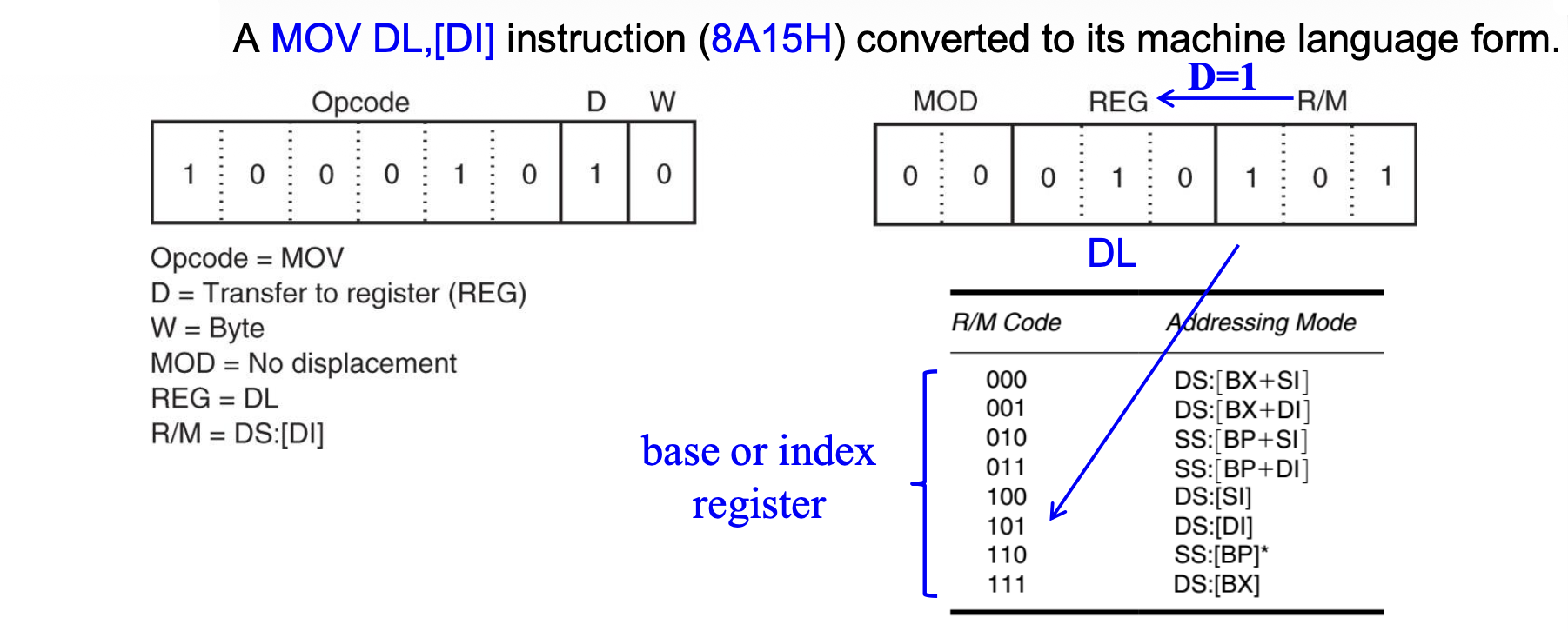 • Opcode = 100010,D = 1,W = 0,MOD = 00,REG/Opcode = 010(DL,R/M = 101([DI]