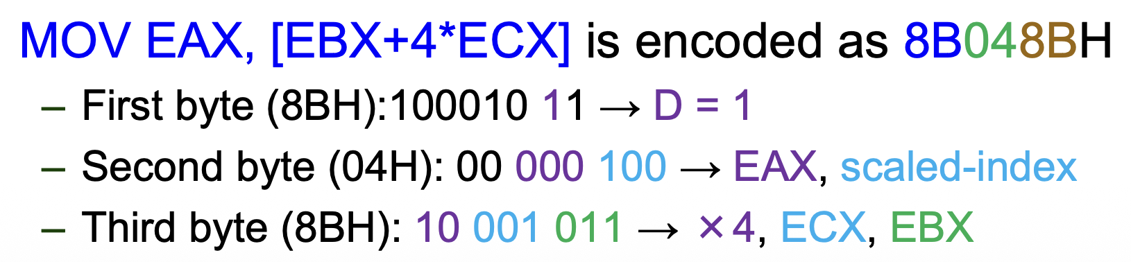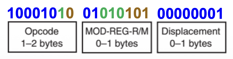 • MOD-REG-R/M 字节中,当两个操作数都使用寄存器寻址时,固定目的操作数和源操作数的编码位置效果较好;然而,当涉及内存寻址时,情况变得复杂