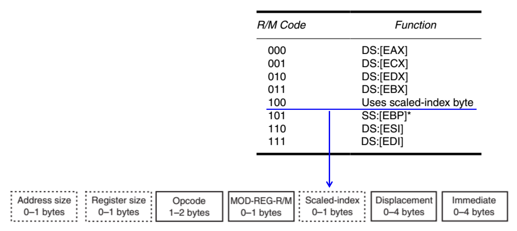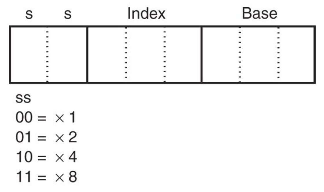 R/M = 100 时,一个叫做比例变址字节(scaled-index byte) 的额外字节出现在指令中,表示比例变址寻址的额外形式。