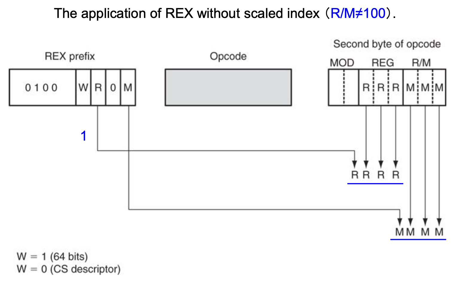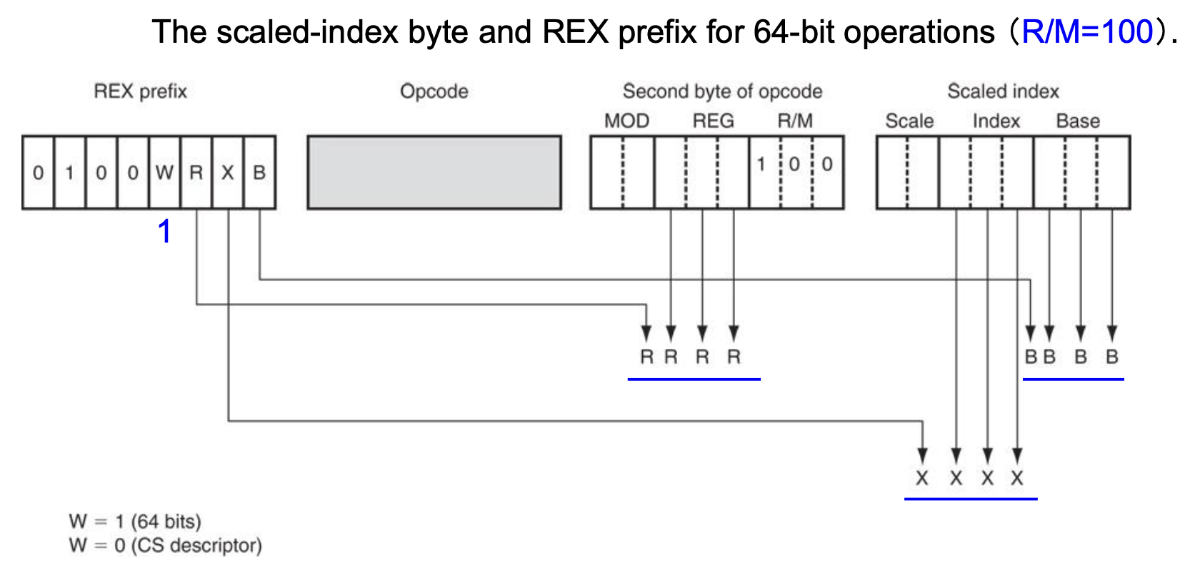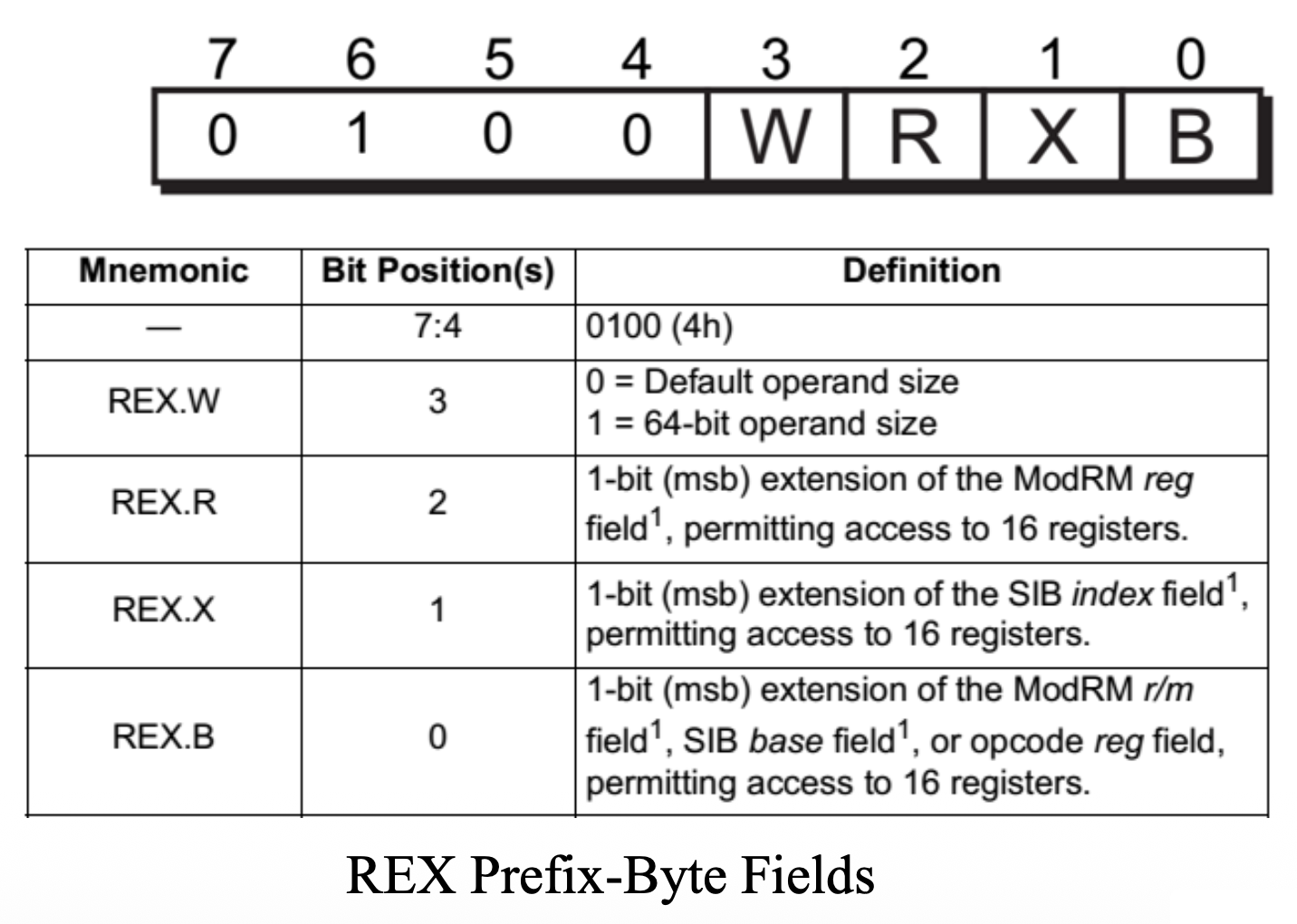• REX 包含五个字段:高四位是 REX 前缀独有的,作为标识;低四位分为四个 1 位字段(W、R、X、B)