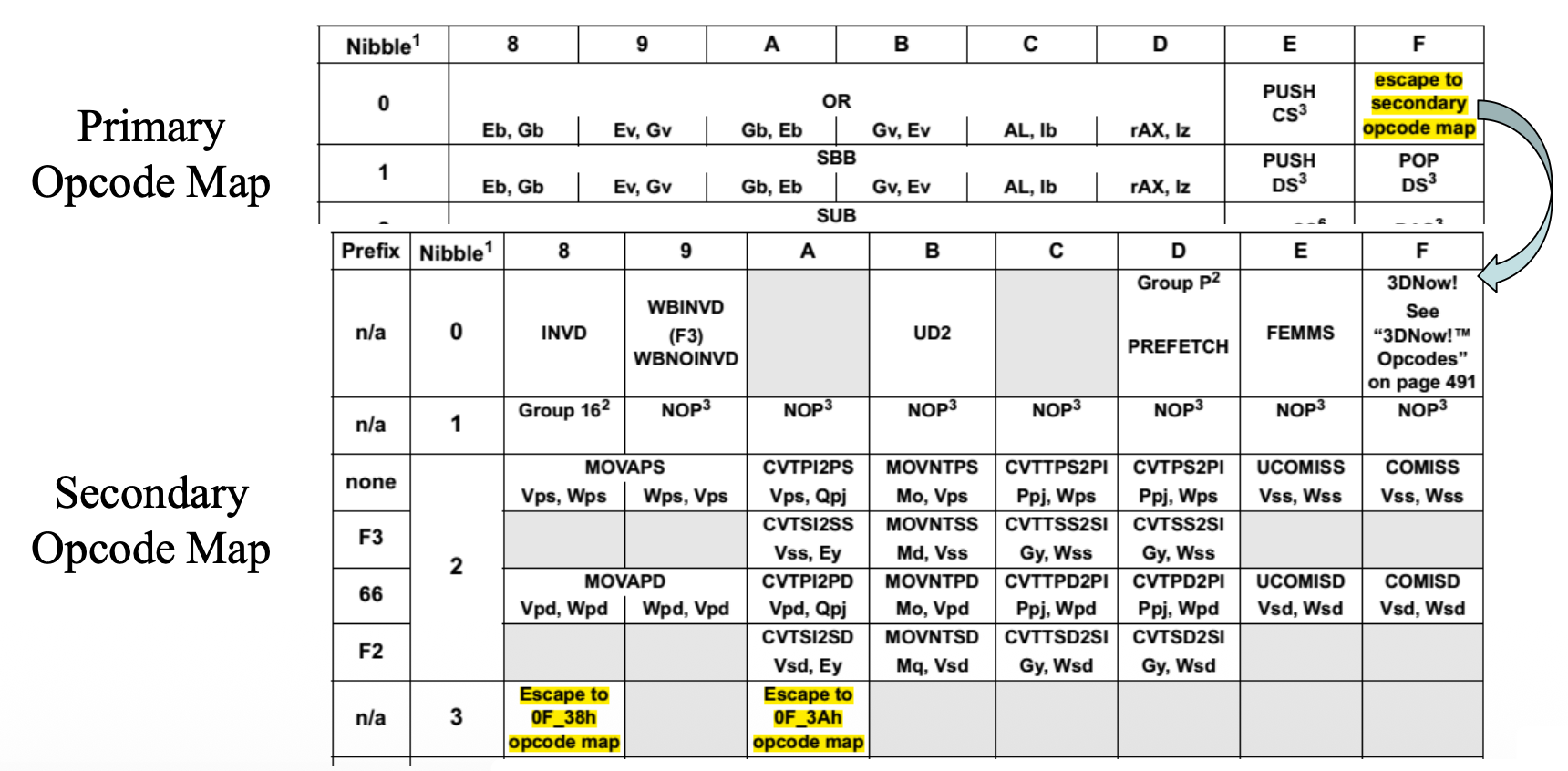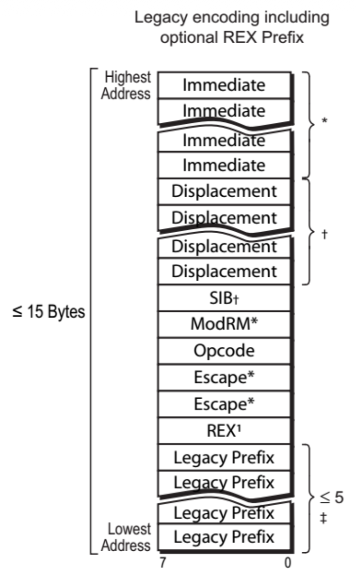 • 总的指令长度不超过 15 个字节,超出限制的话就会触发通用保护异常(general-protection exception)