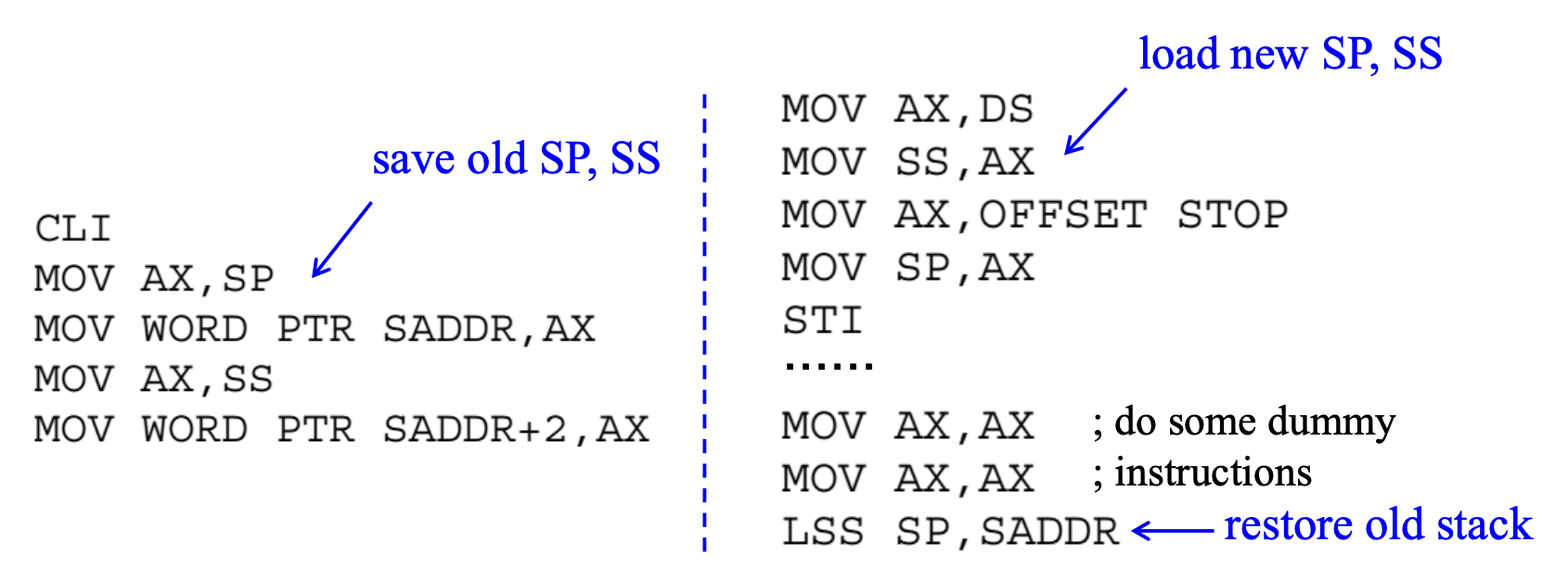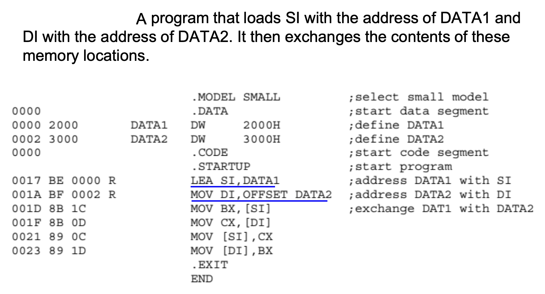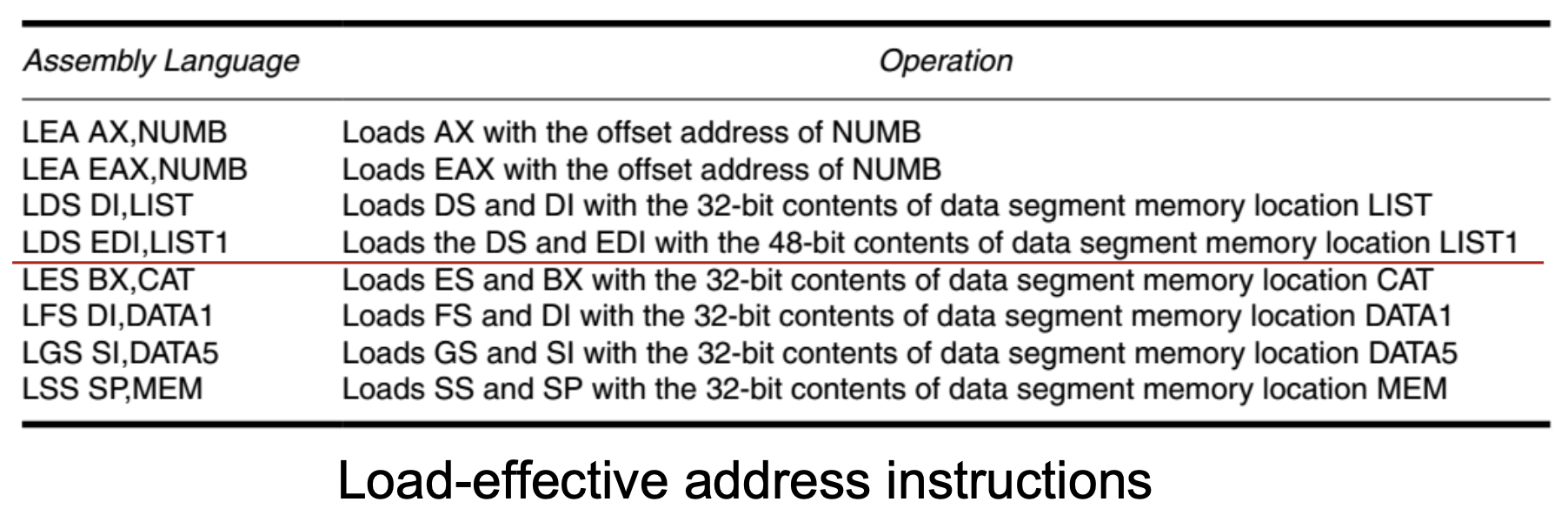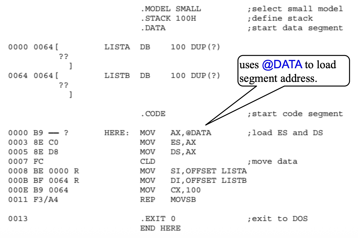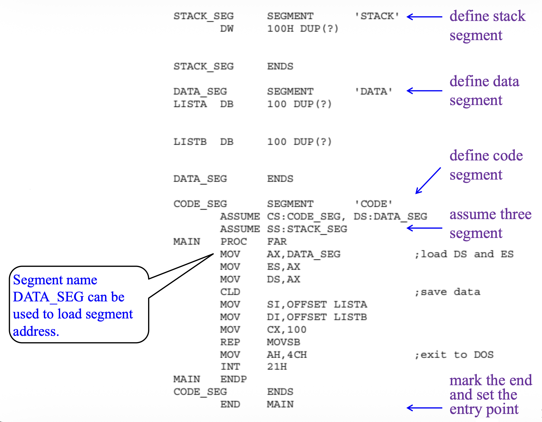 • assume CS:CSEG, DS:DSEG, ES:DSEG, SS:SSEG
